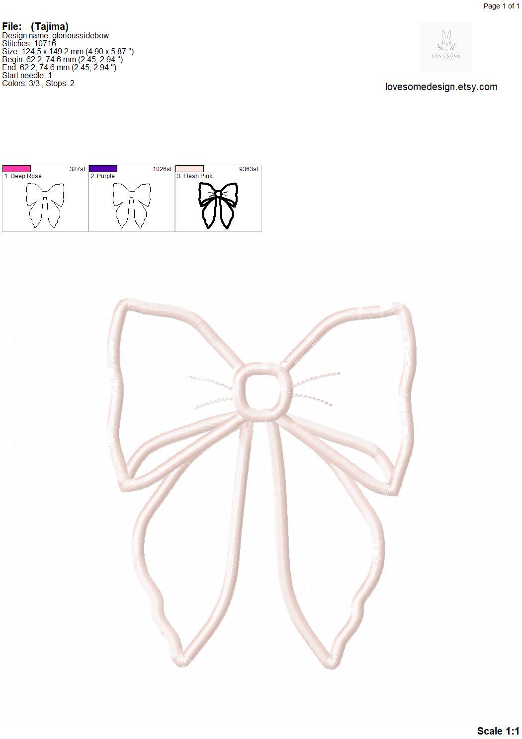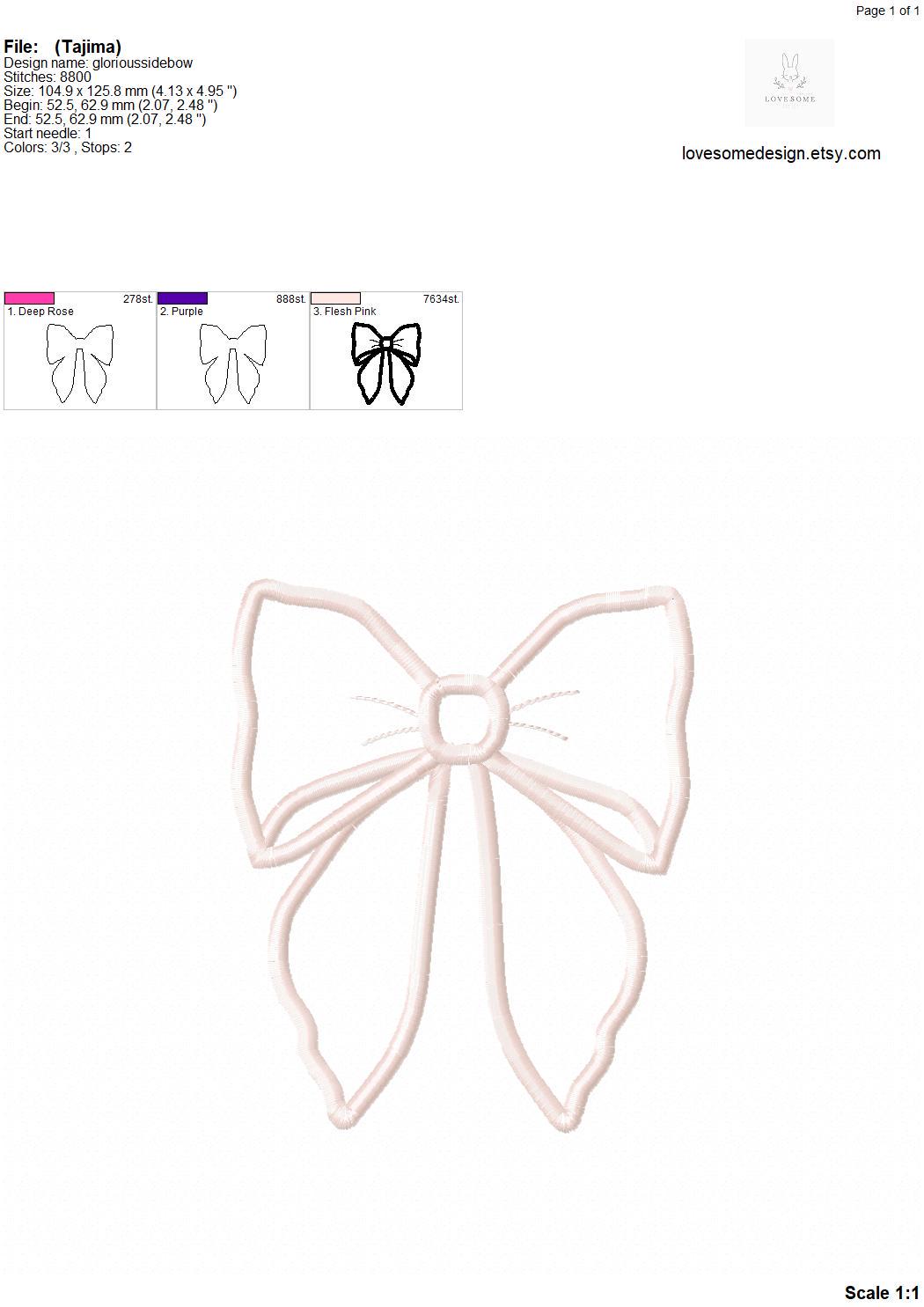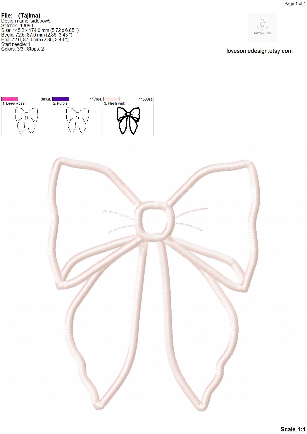 This listing includes one cute applique side seam bow design for machine embroidery in four sizes, each appr. in 4inch, 5inch, 5x7 and 7inch size for embroidery hoops in different sizes.