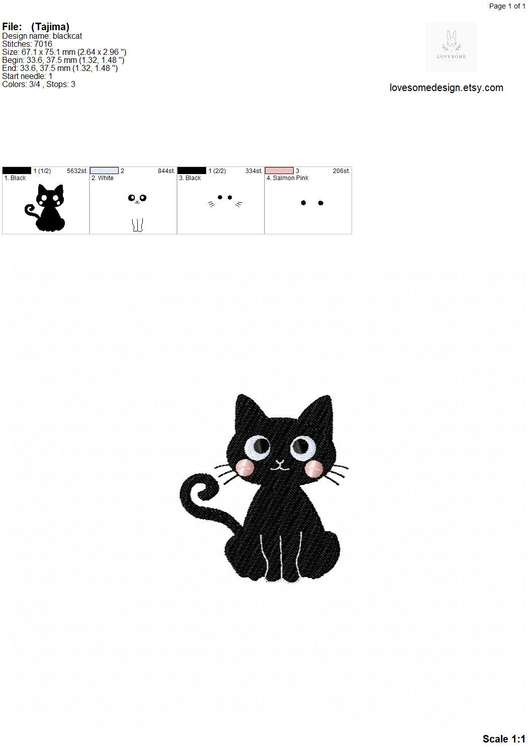 This listing features machine embroidery files of a cute black cat design in three sizes, including 3inch, 3.5inch and 4inch size for embroidery hoop sizes 4x4 and bigger.