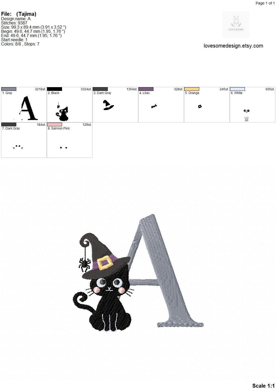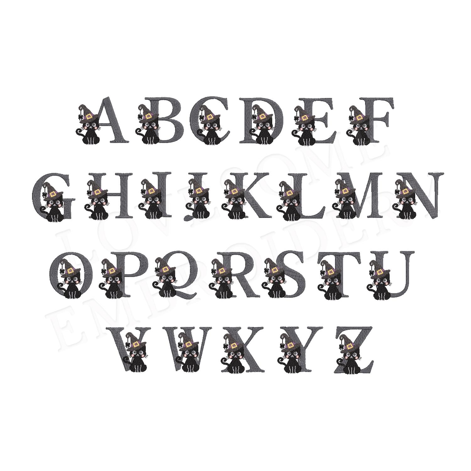 This listing features a machine embroidery font set which includes embroidery files of 26 uppercase letters with a cute black cat in a witch hat in appr. 4inch size. (For the whole set, pls see the listing images.)