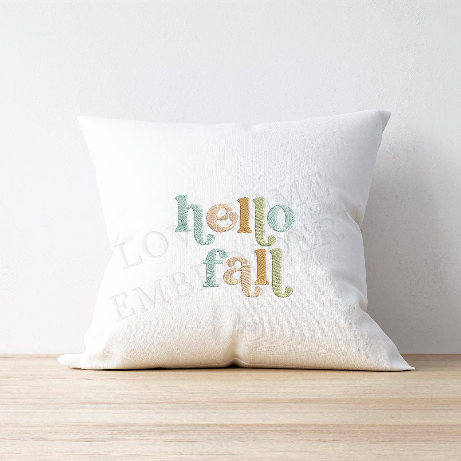 This listing features a machine embroidery design of lettering "Hello Fall" for retro style funky autumn sweatshirt or groovy style fall tshirt embroidery in 7inch size.