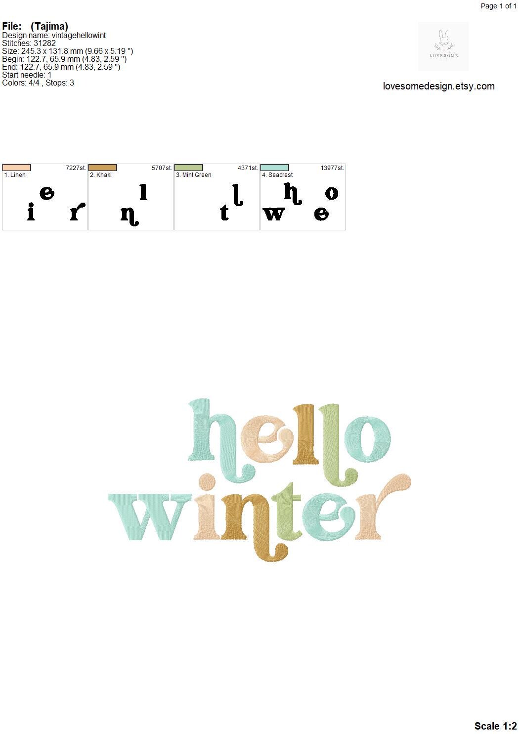 This listing features a machine embroidery design of lettering "Hello winter" for retro style funky winter sweatshirt or groovy style tshirt embroidery in 10inch size.