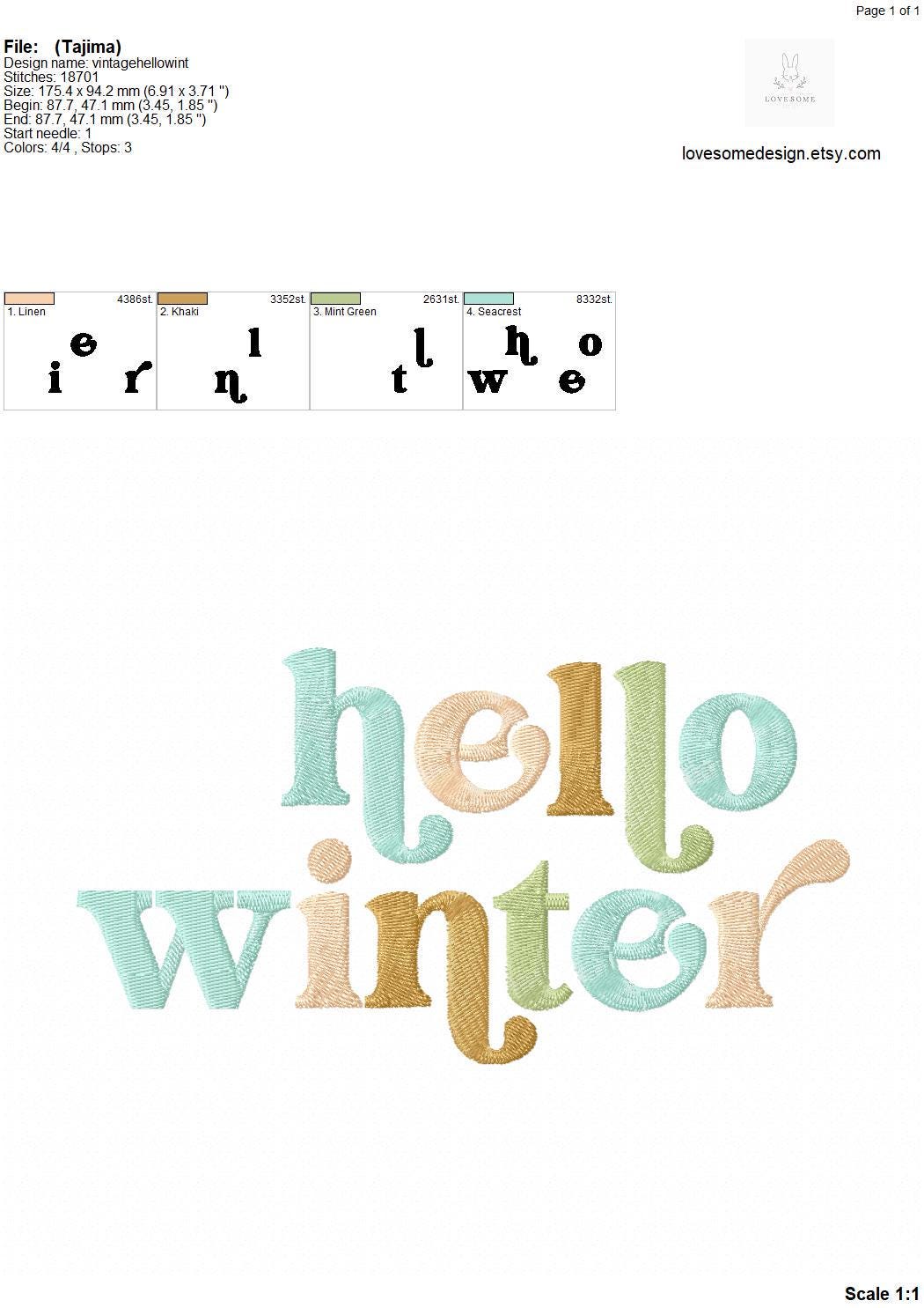 This listing features a machine embroidery design of lettering "Hello winter" for retro style funky winter sweatshirt or groovy style tshirt embroidery in 7inch size.