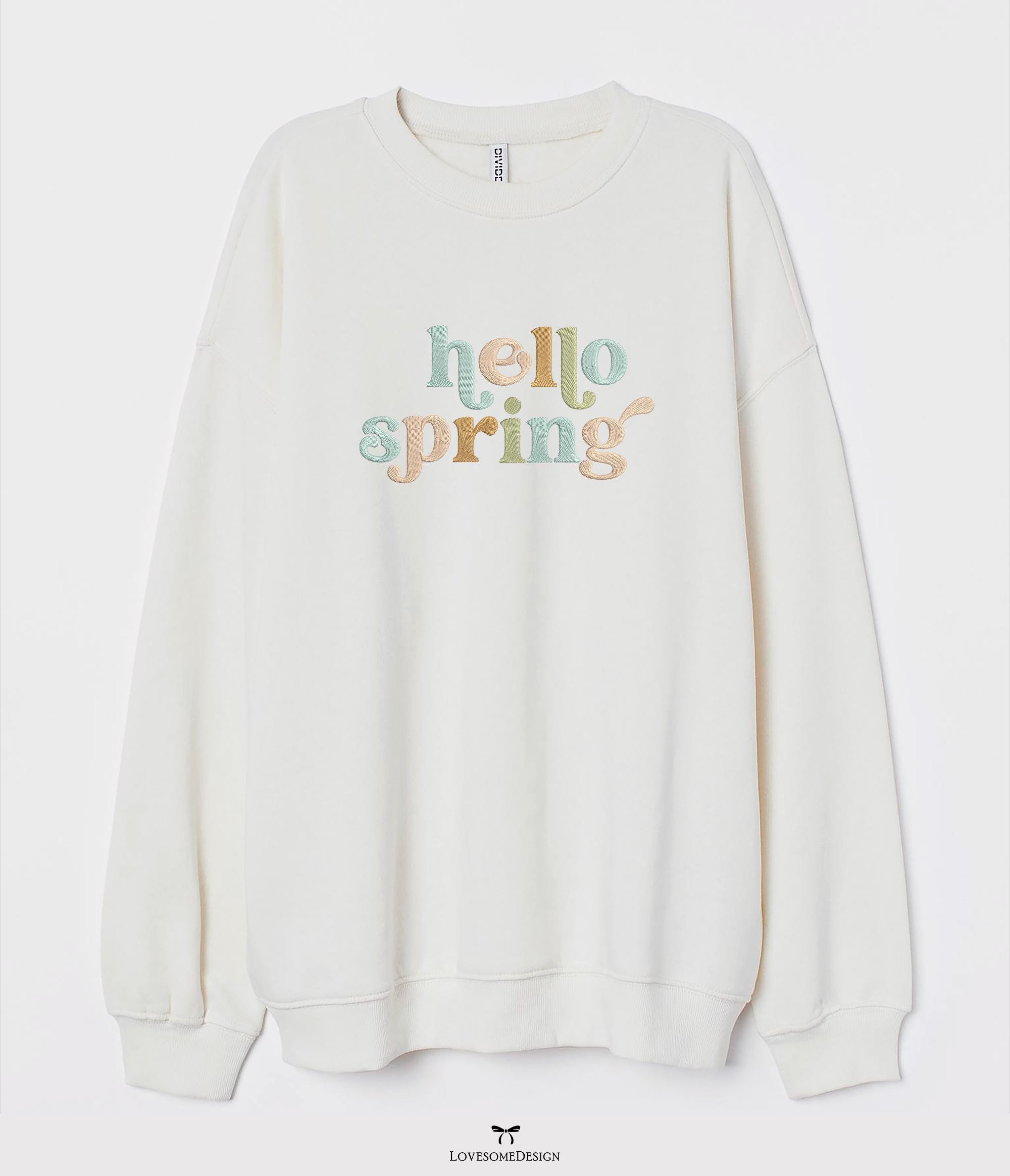 This listing features a machine embroidery design of lettering "Hello spring" for retro style funky spring sweatshirt or groovy style tshirt embroidery in 5inch size.