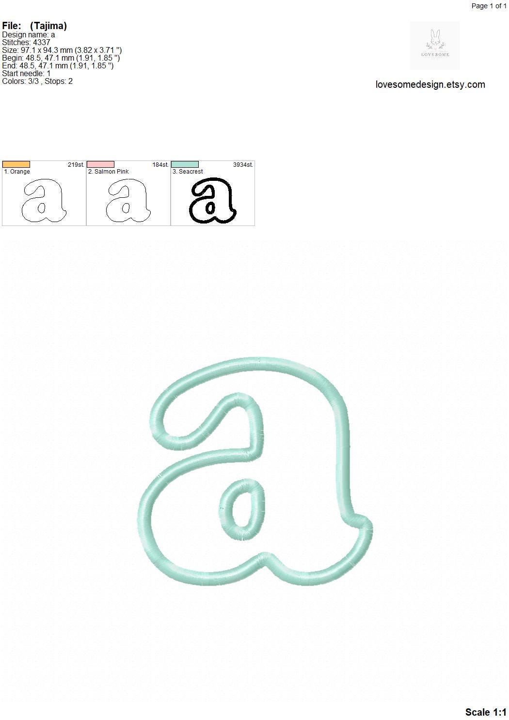 This listing features a machine embroidery font set which includes embroidery files of 26 lowercase applique letters (a-z) in 5inch size applique alphabet. (For the whole set, pls see the listing images.)