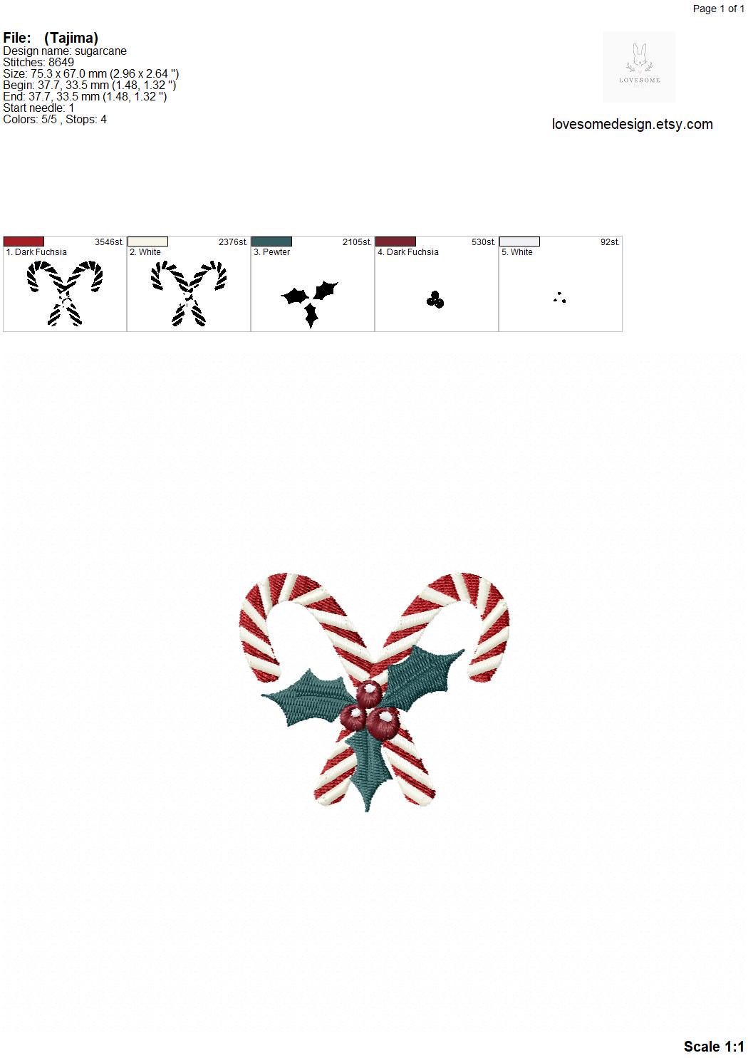 Classical cute candy cane with a holly foliage embroidery design, fancy winter holiday decorative christmas embroidery file appr. in 3inch size.