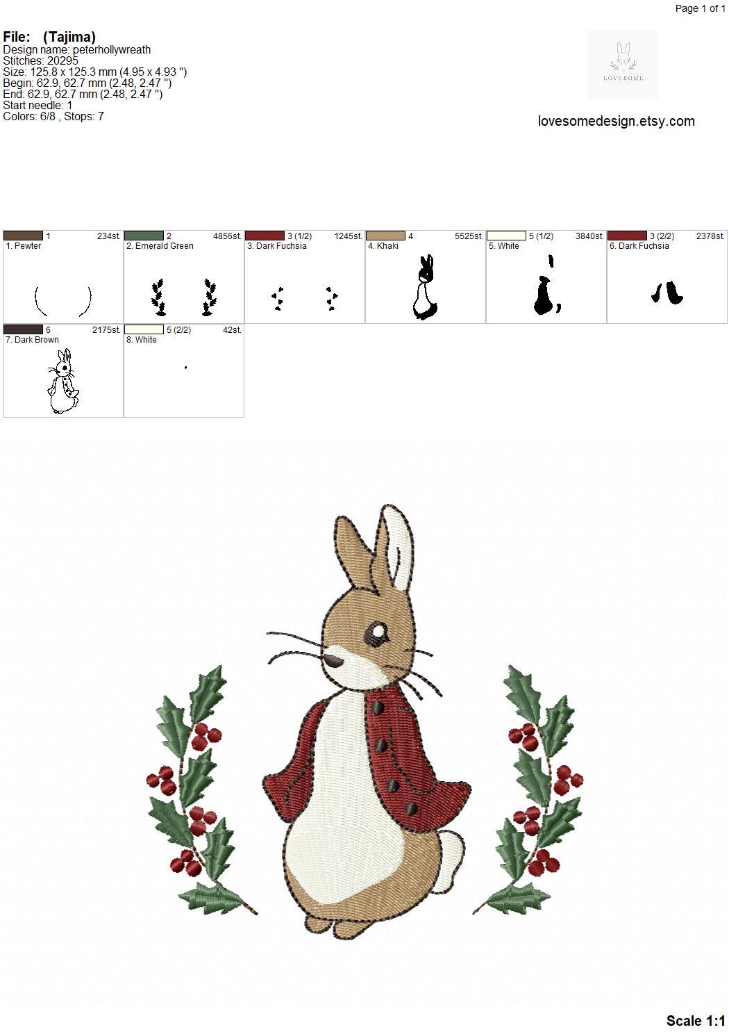 This listing features one machine embroidery file of Peter Rabbit with a holly berries wreath in 5 inch size.