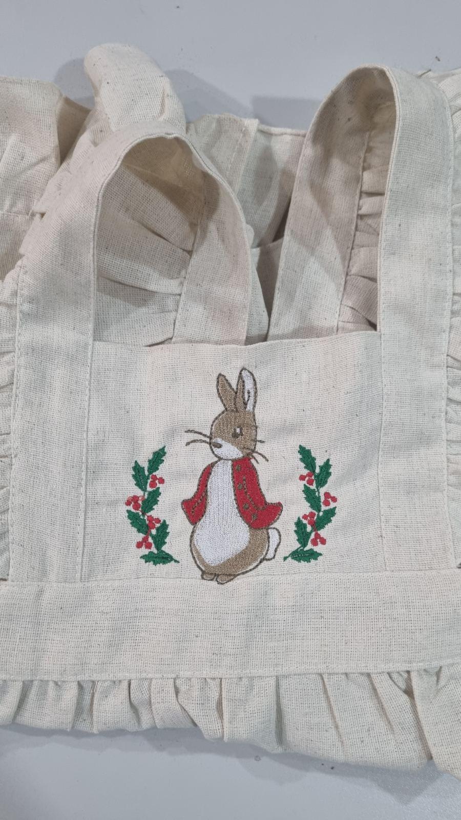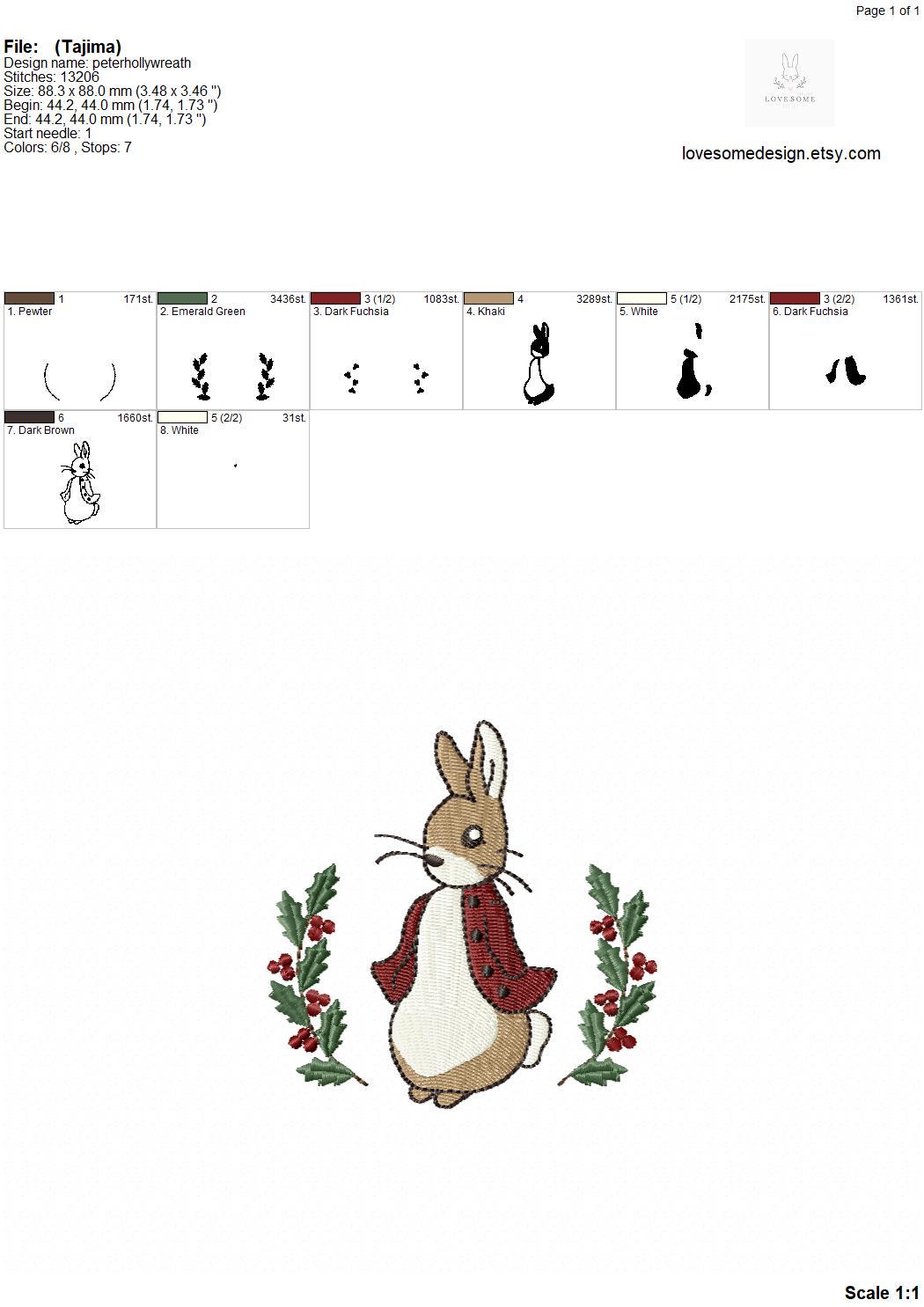This listing features one machine embroidery file of Peter Rabbit with a holly berries wreath in 3.5 inch size.