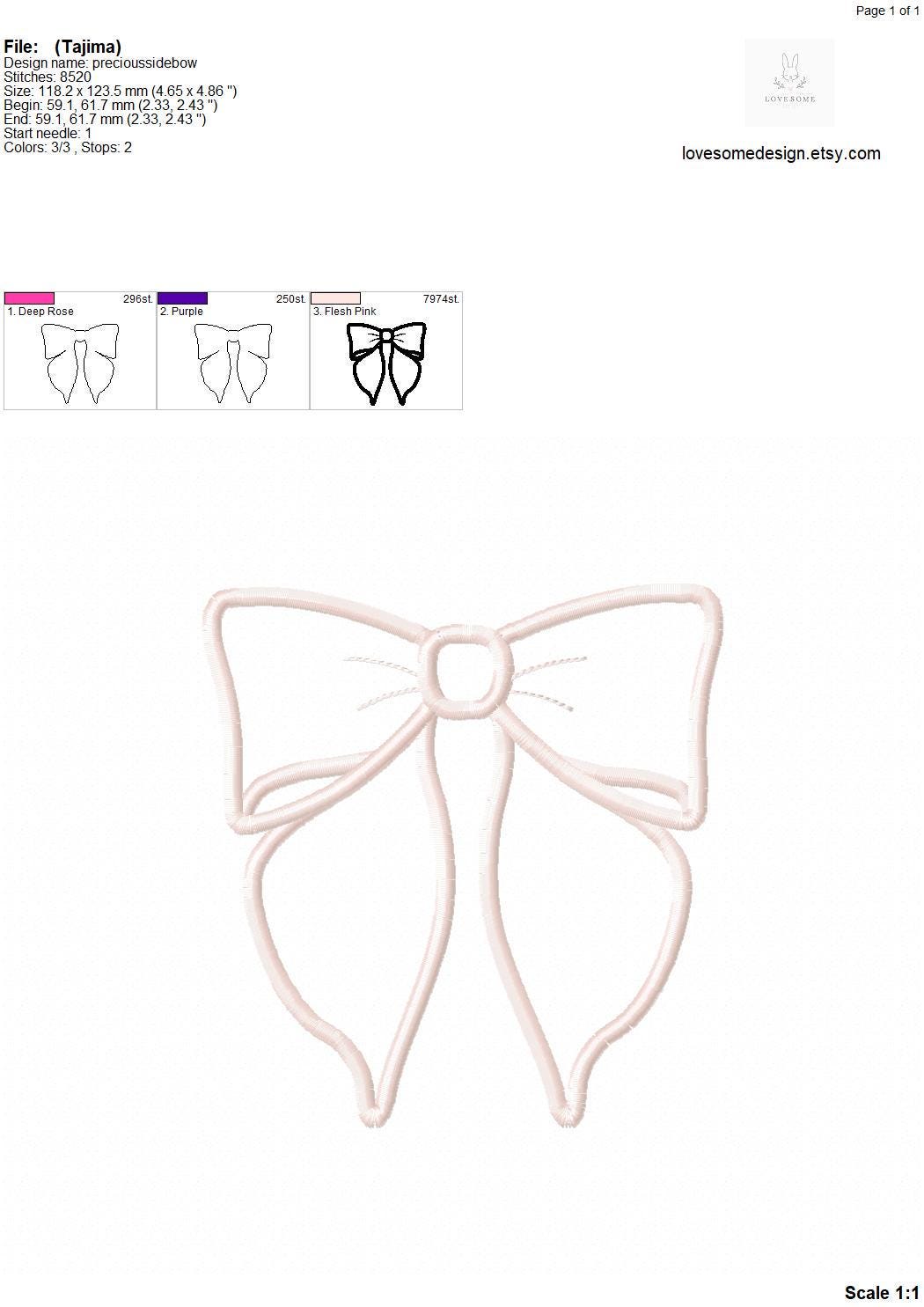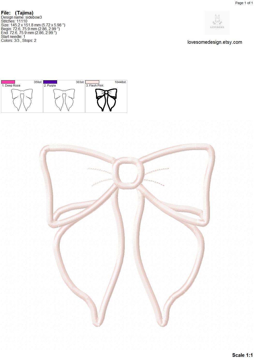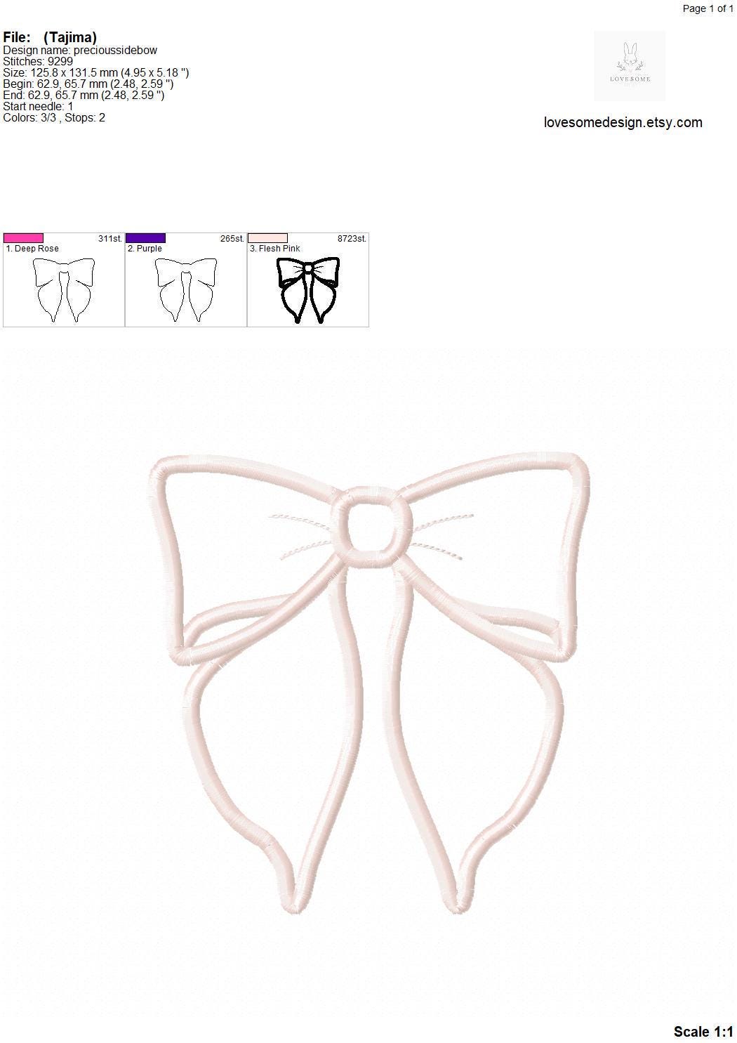 This listing includes one cute applique side seam bow design for machine embroidery in four sizes, each appr. in 4inch, 5inch, 5x7 and 7inch size for embroidery hoops in different sizes.