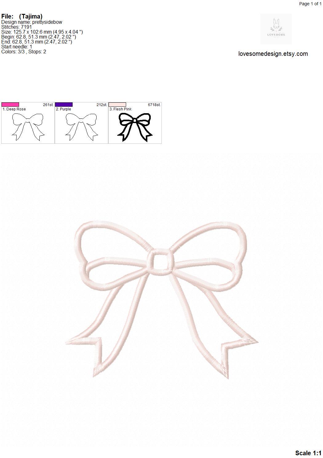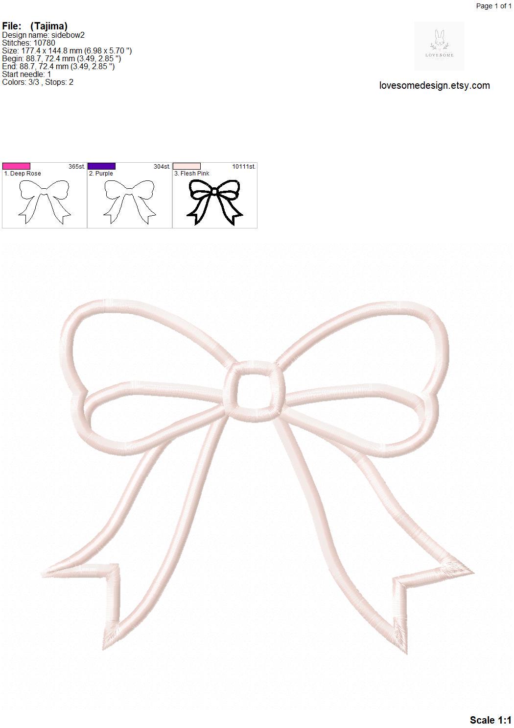 This listing includes one cute applique side seam bow design for machine embroidery in four sizes, each appr. in 4inch, 5inch, 5x7 and 7inch size for embroidery hoops in different sizes.