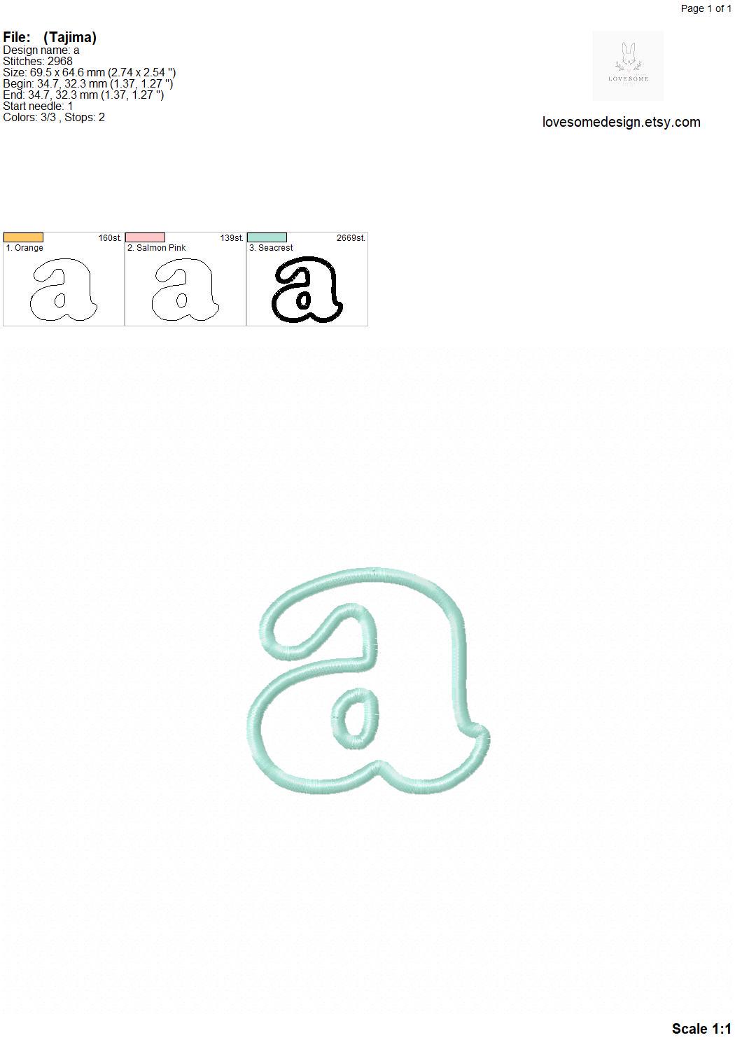 This listing features a machine embroidery font set which includes embroidery files of 26 lowercase applique letters (a-z) in 3.5inch size applique alphabet. (For the whole set, pls see the listing images.)