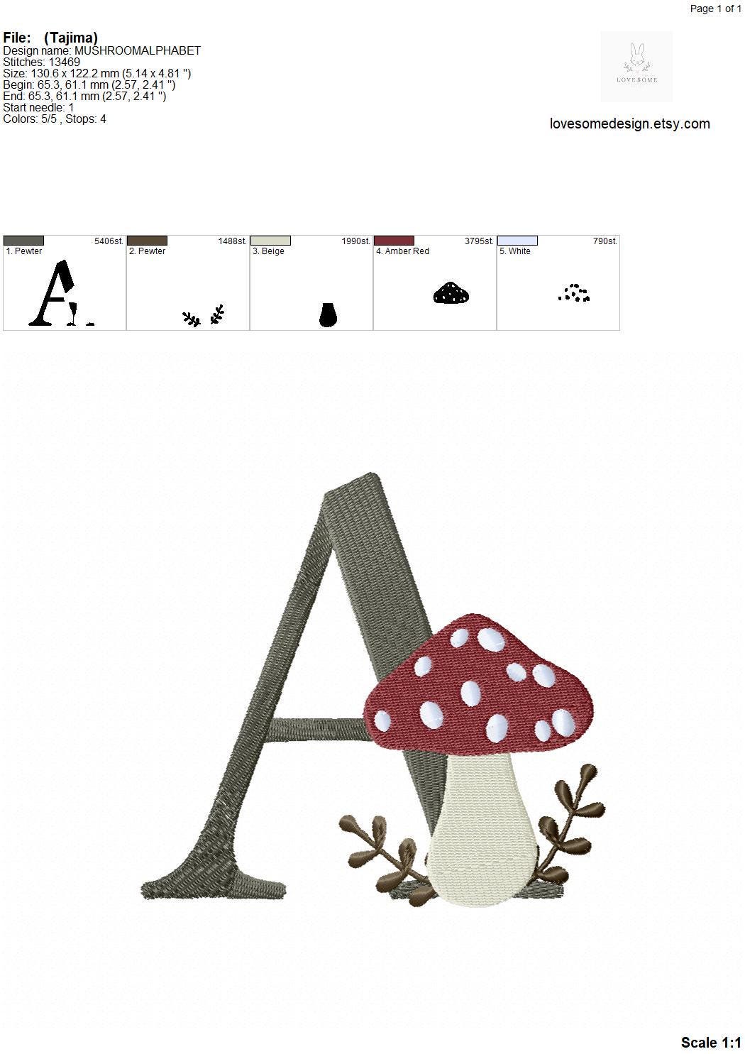 This listing features a machine embroidery font set which includes embroidery files of 26 uppercase letters with a cute mushroom in 5inch size. (For the whole set, pls see the listing images.)