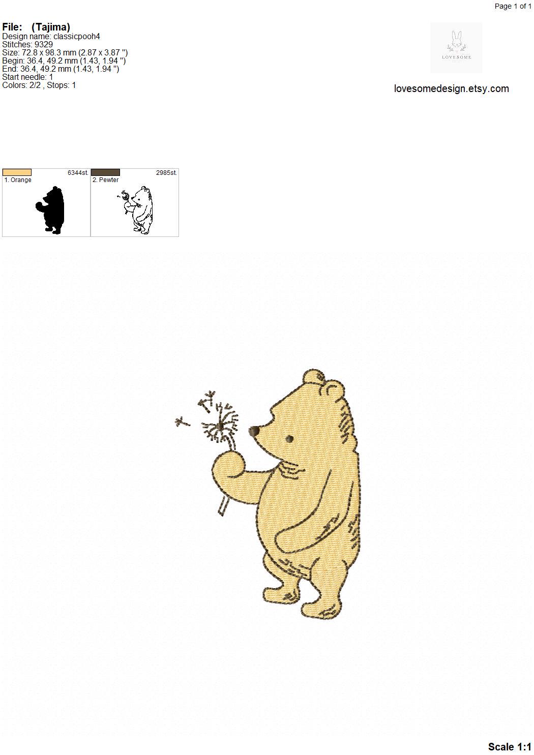 This listing features a machine embroidery file of Classic Winnie the Pooh design with a dandelion in 4 inch size.