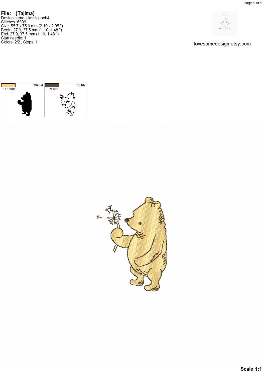 This listing features a machine embroidery file of Classic Winnie the Pooh design with a dandelion in 3 inch size.