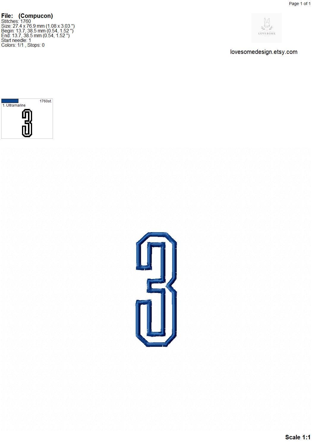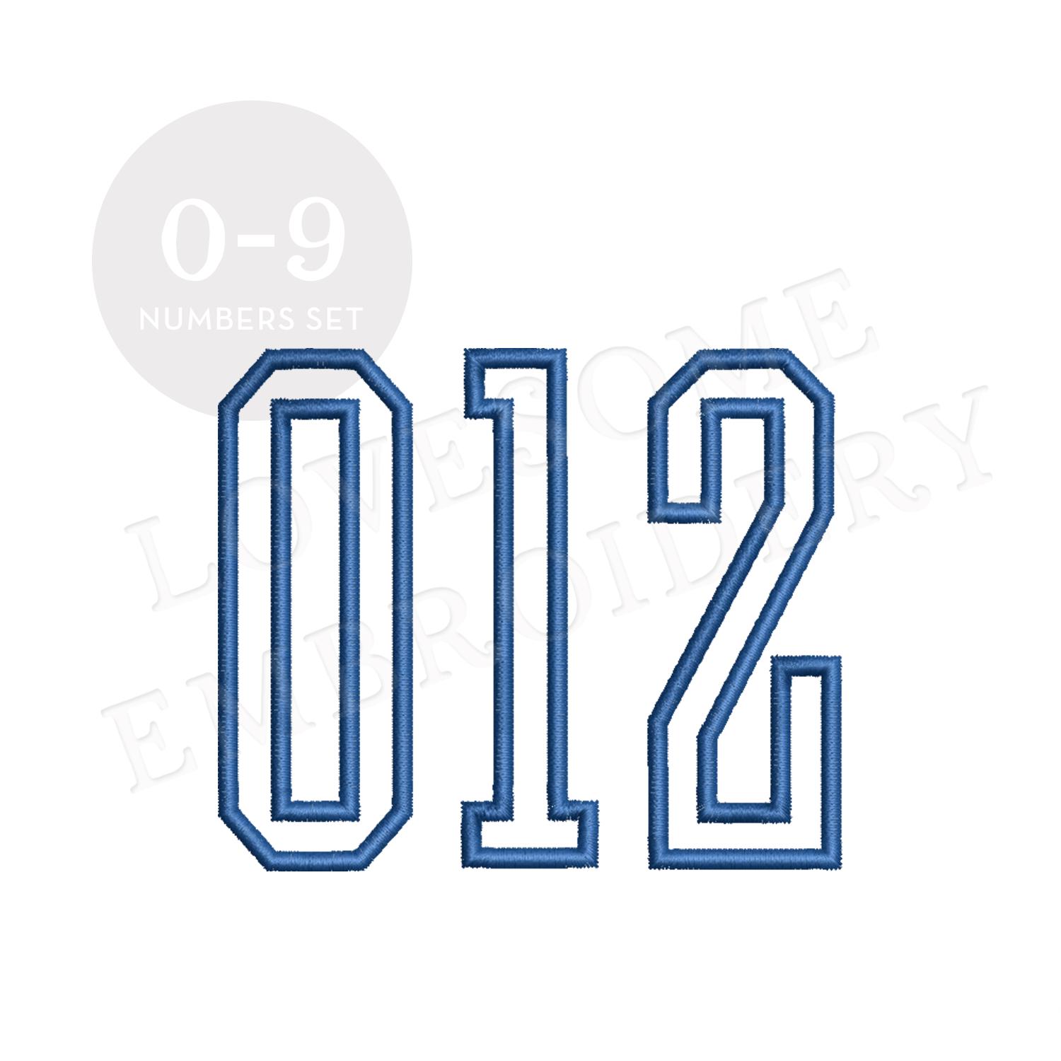This listing features a machine embroidery outline college numbers set in satin stitch which includes embroidery files of 10 numbers in 3inch size. (For the whole set, pls see the listing images.)