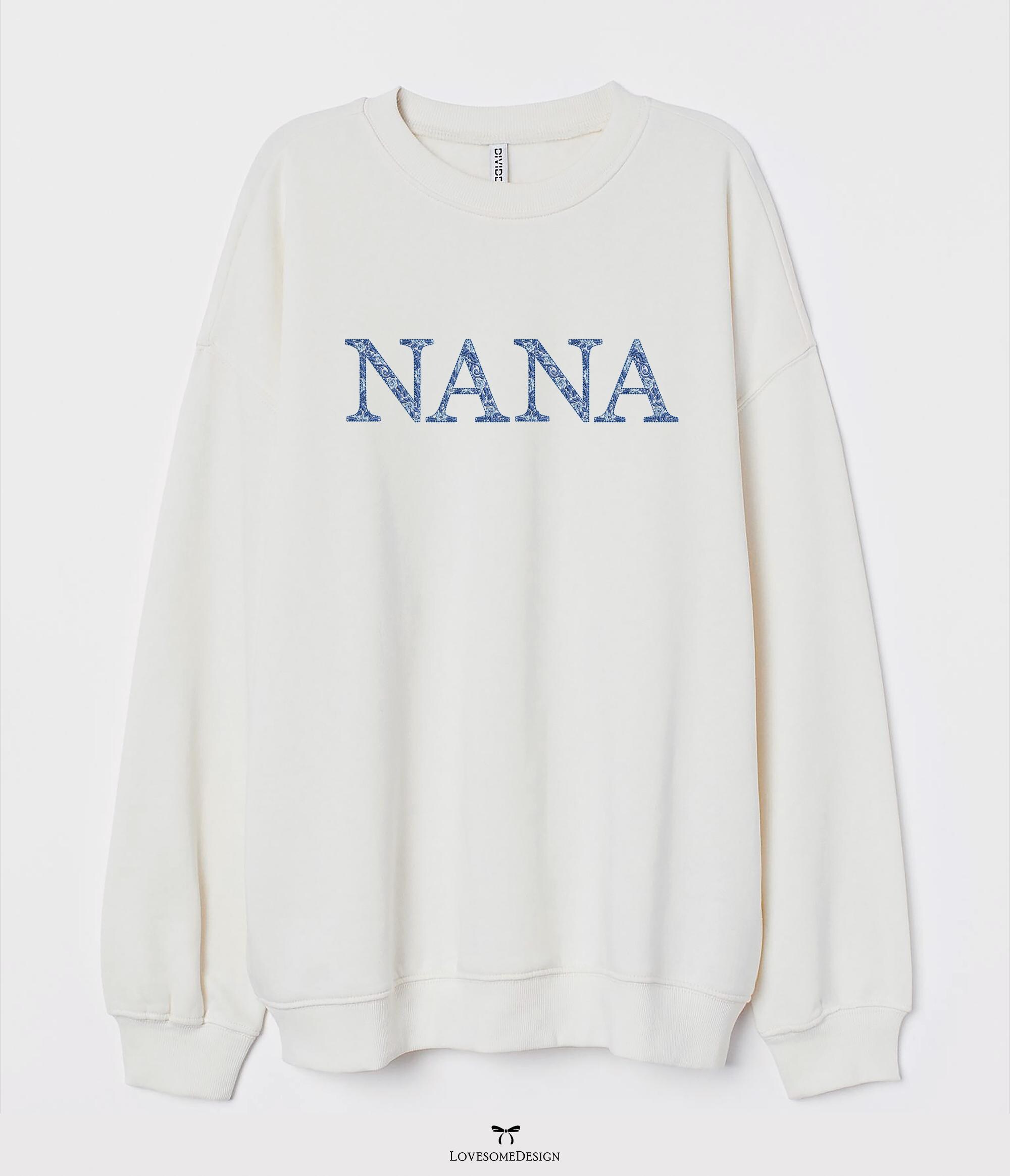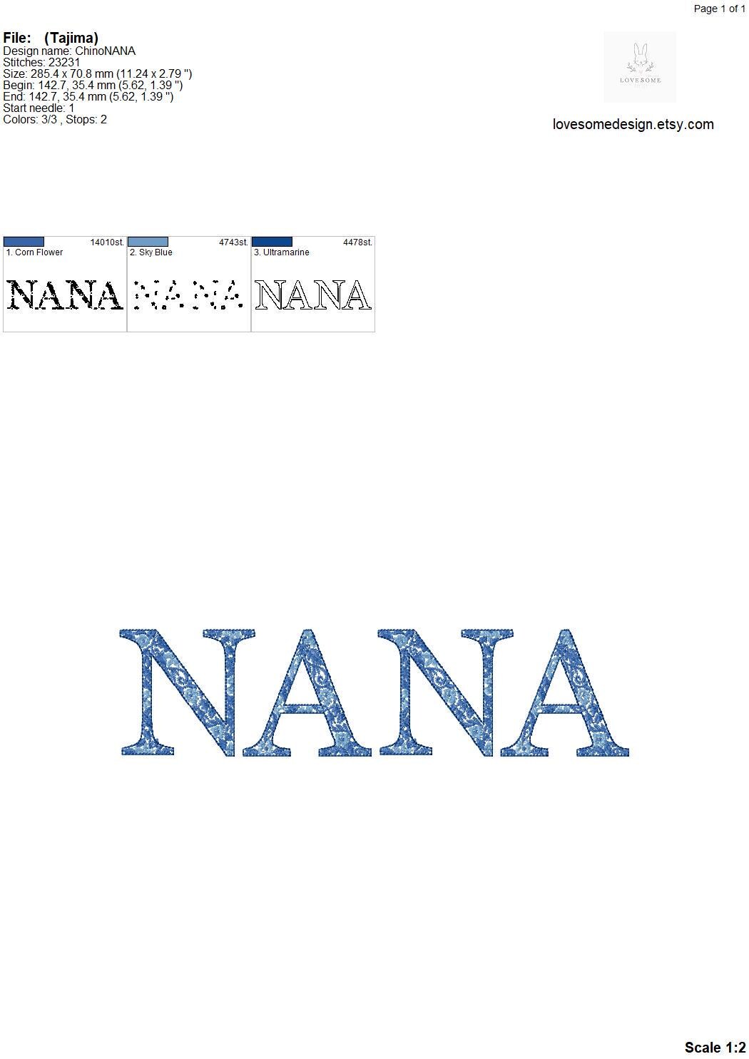 This listing features a machine embroidery file of word "NANA" which has a beautiful blue chinoiserie fill design in 12inch size.