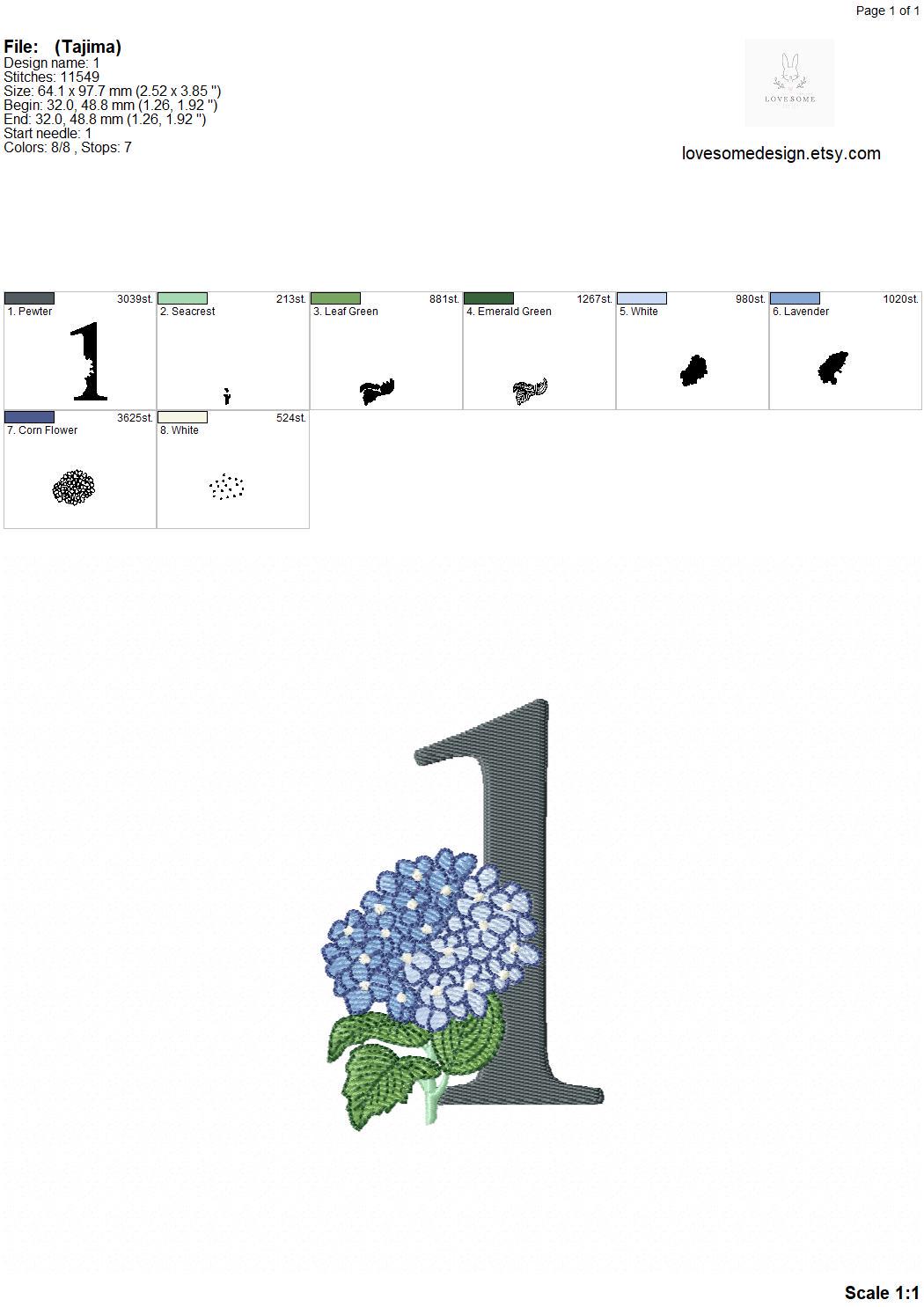This listing features a machine embroidery numbers set which includes embroidery files of ten numbers (0-9) with beautiful hydrangea design in one size (4 inch size) for 4x4 hoops for machine embroidery. (For the whole set, pls see the listing images.)
