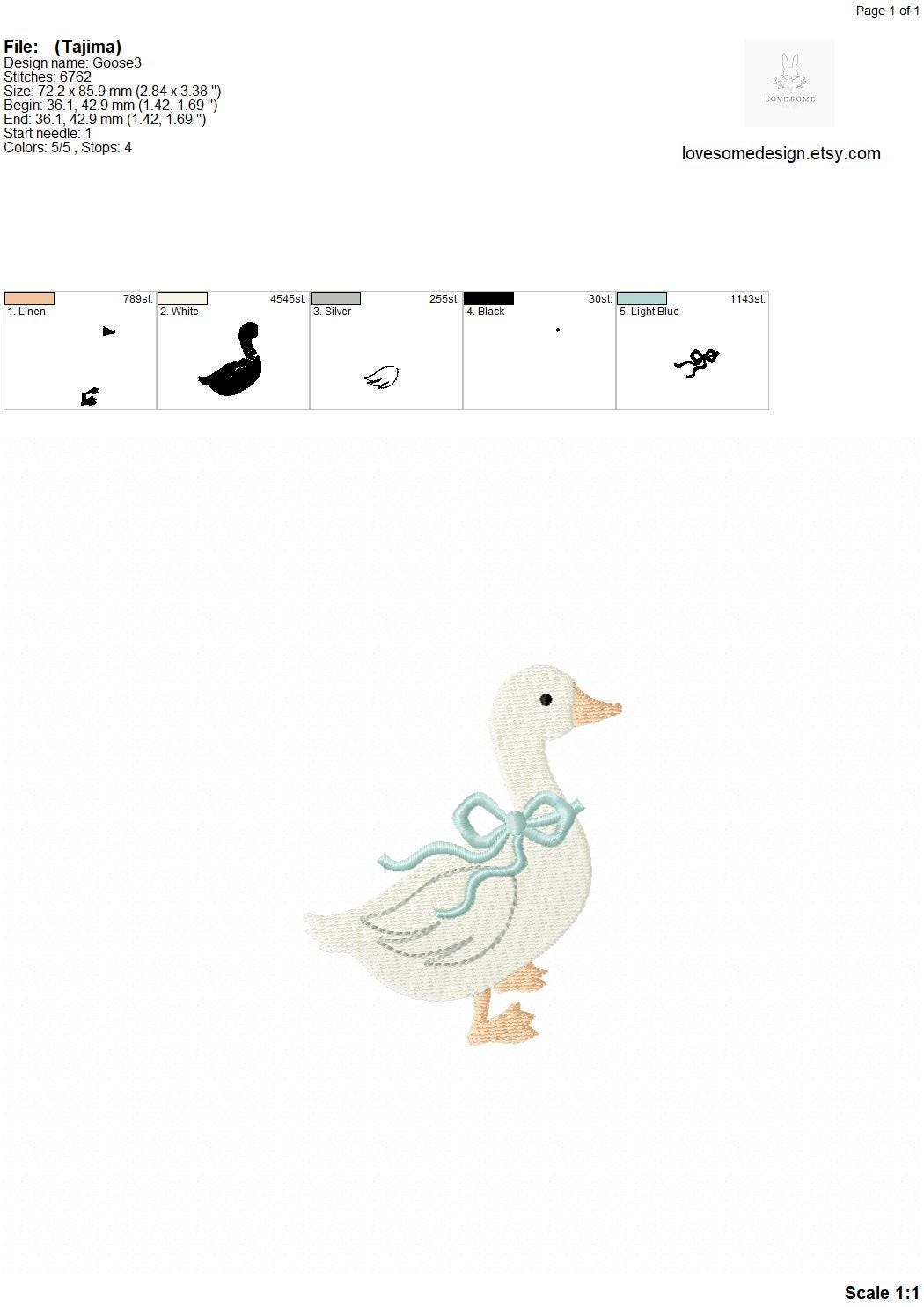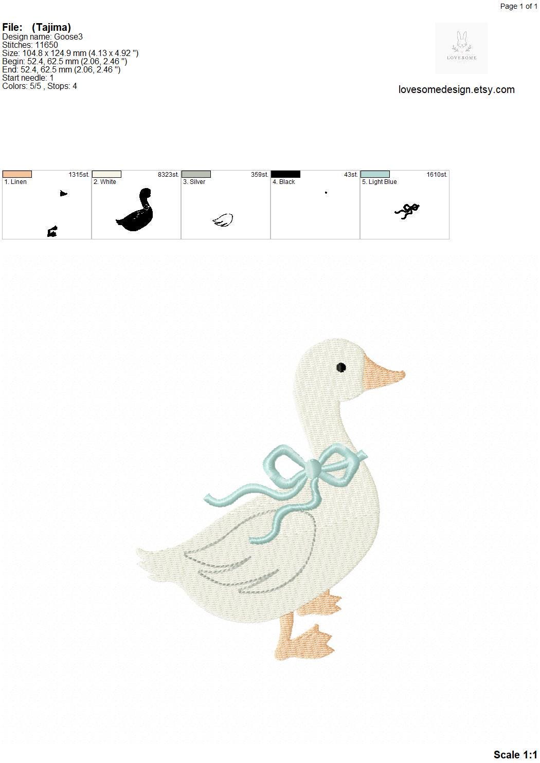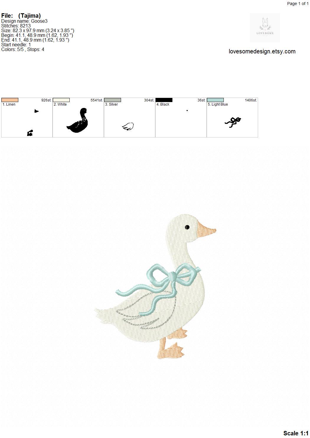 This listing includes one cute silly goose with a lovely little bow design for machine embroidery in three big sizes, each appr. in 3.5inch, 4inch and 5inch size for embroidery hoops in different sizes.