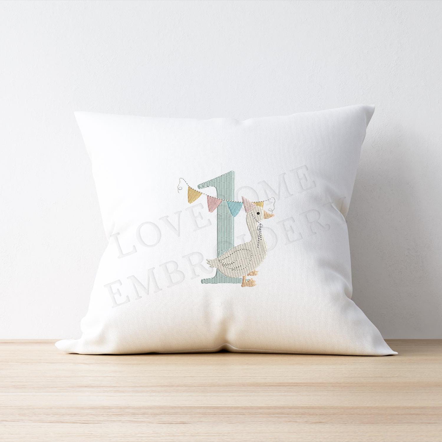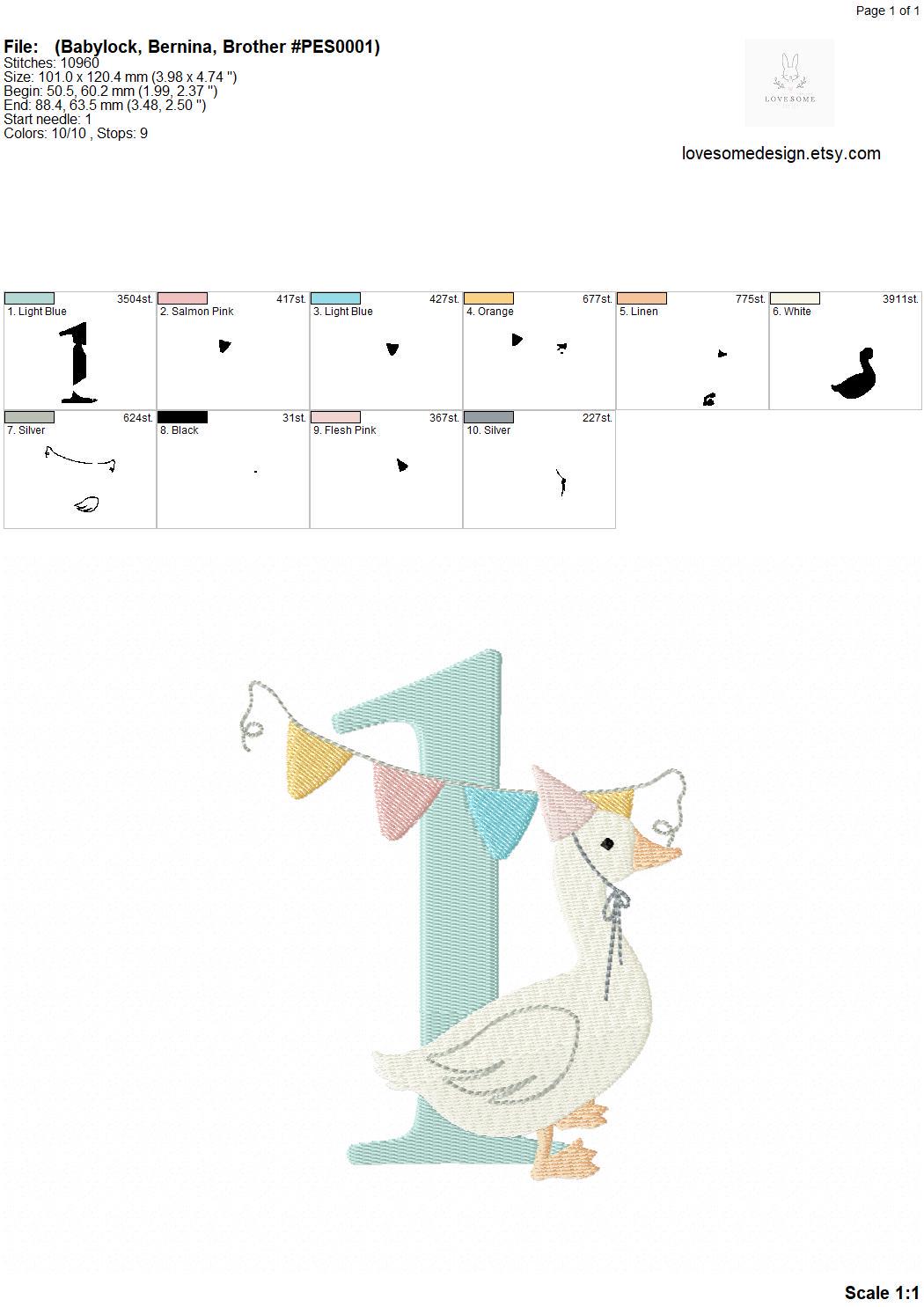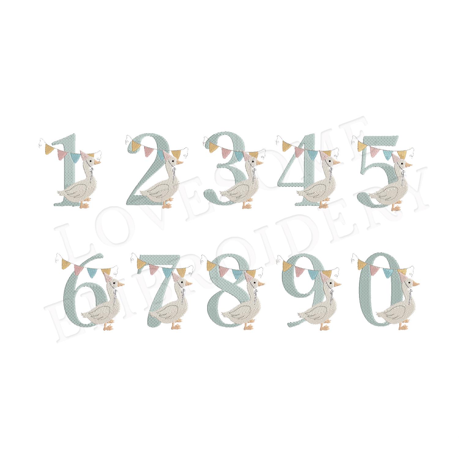 This listing features a machine embroidery numbers set which includes embroidery files of ten numbers (0-9) with cute silly goose with a party hat and bunting design in 5inch size for machine embroidery. (For the whole set, pls see the listing images.)