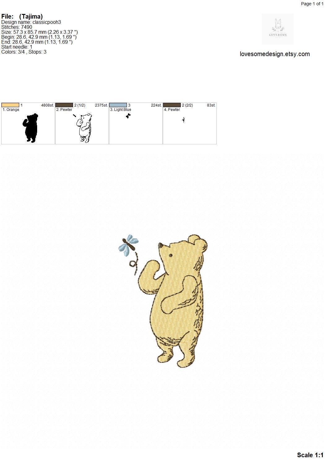 This listing features a machine embroidery file of Classic Winnie the Pooh design with a butterfly in 3.5 inch size.