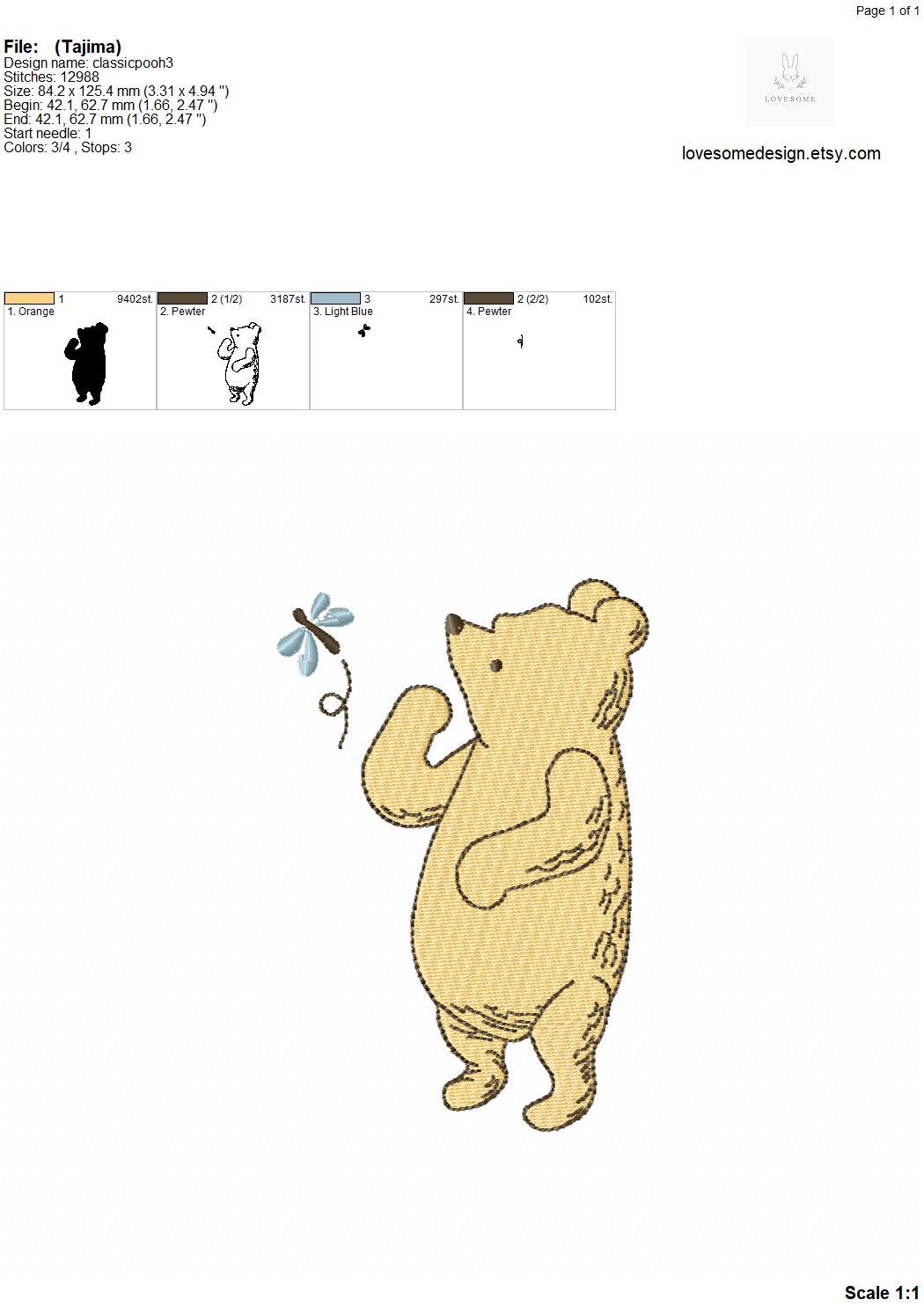 This listing features a machine embroidery file of Classic Winnie the Pooh design with a butterfly in 5 inch size.