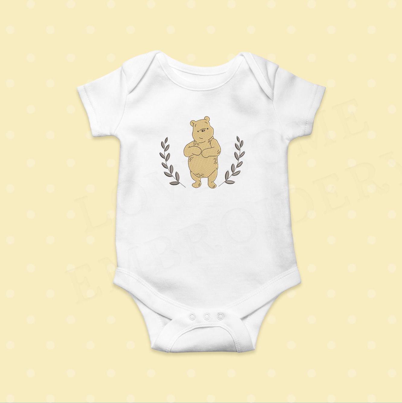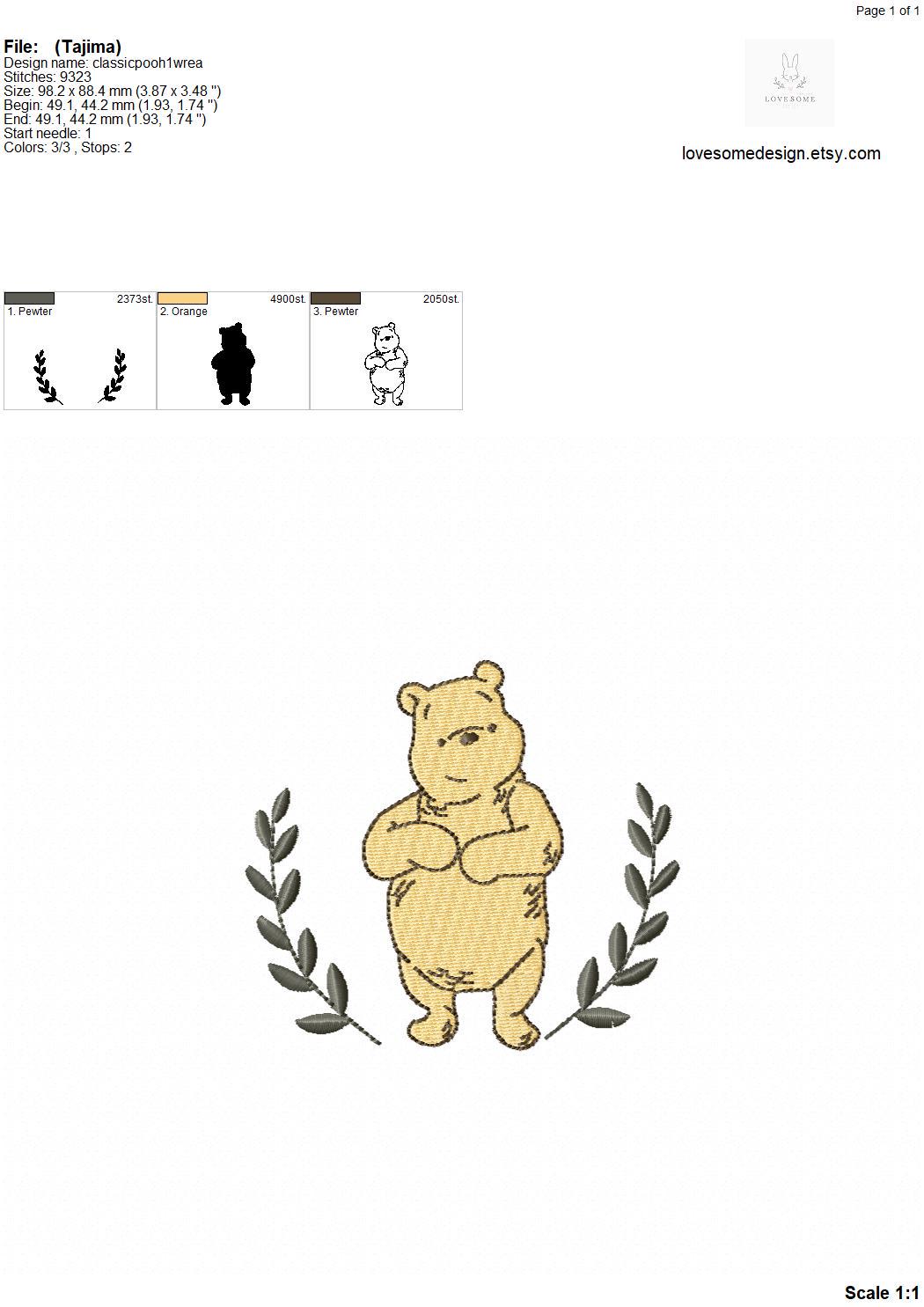 This listing features a machine embroidery file of Classic Winnie the Pooh with a laurel wreath design in 4 inch size.