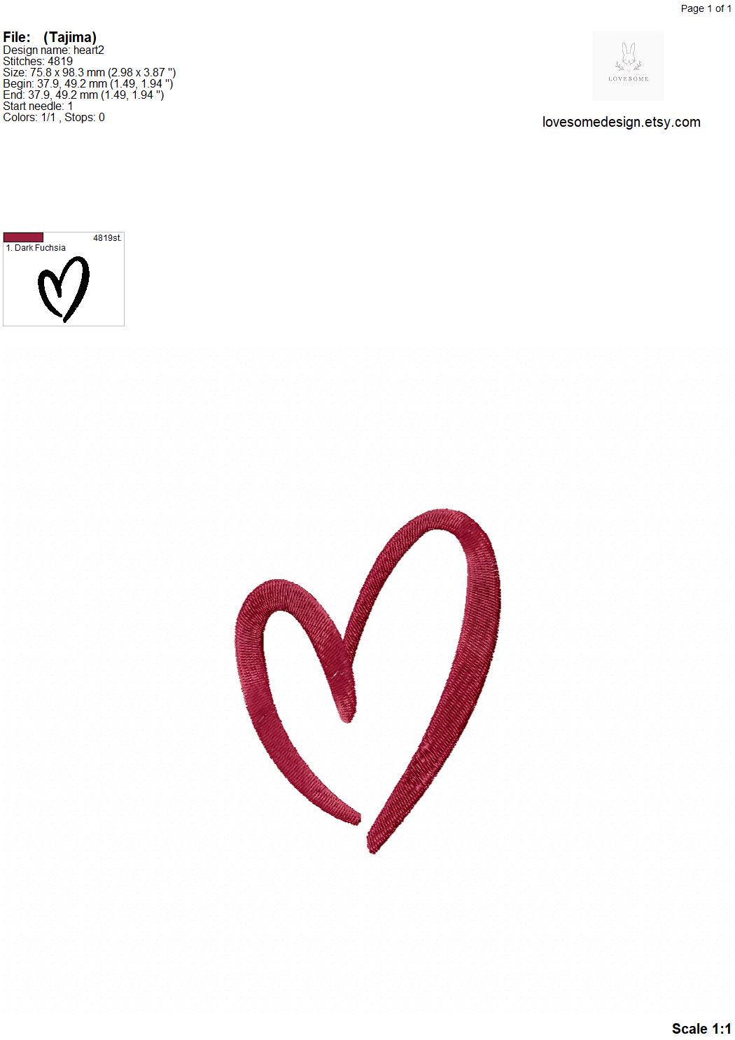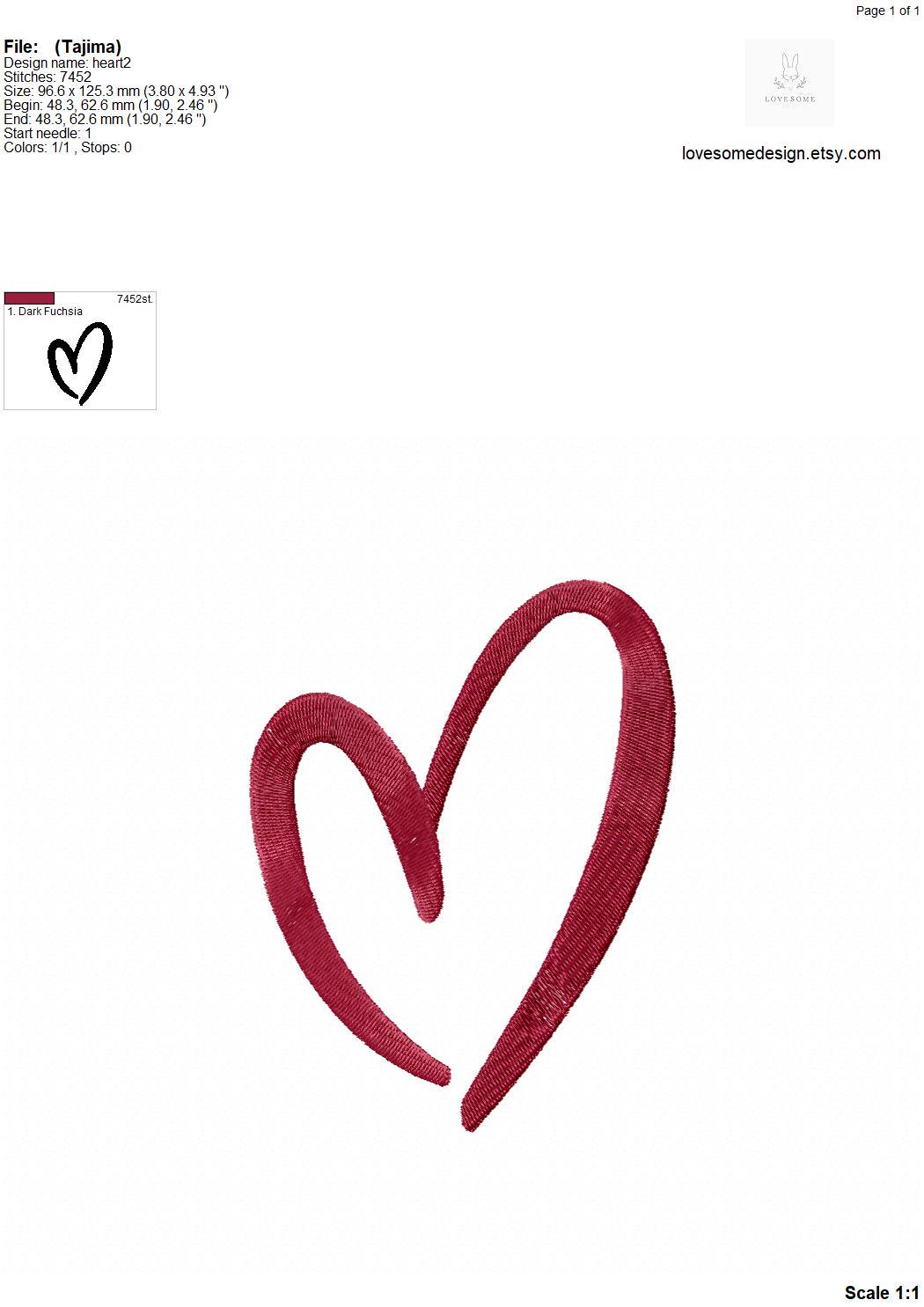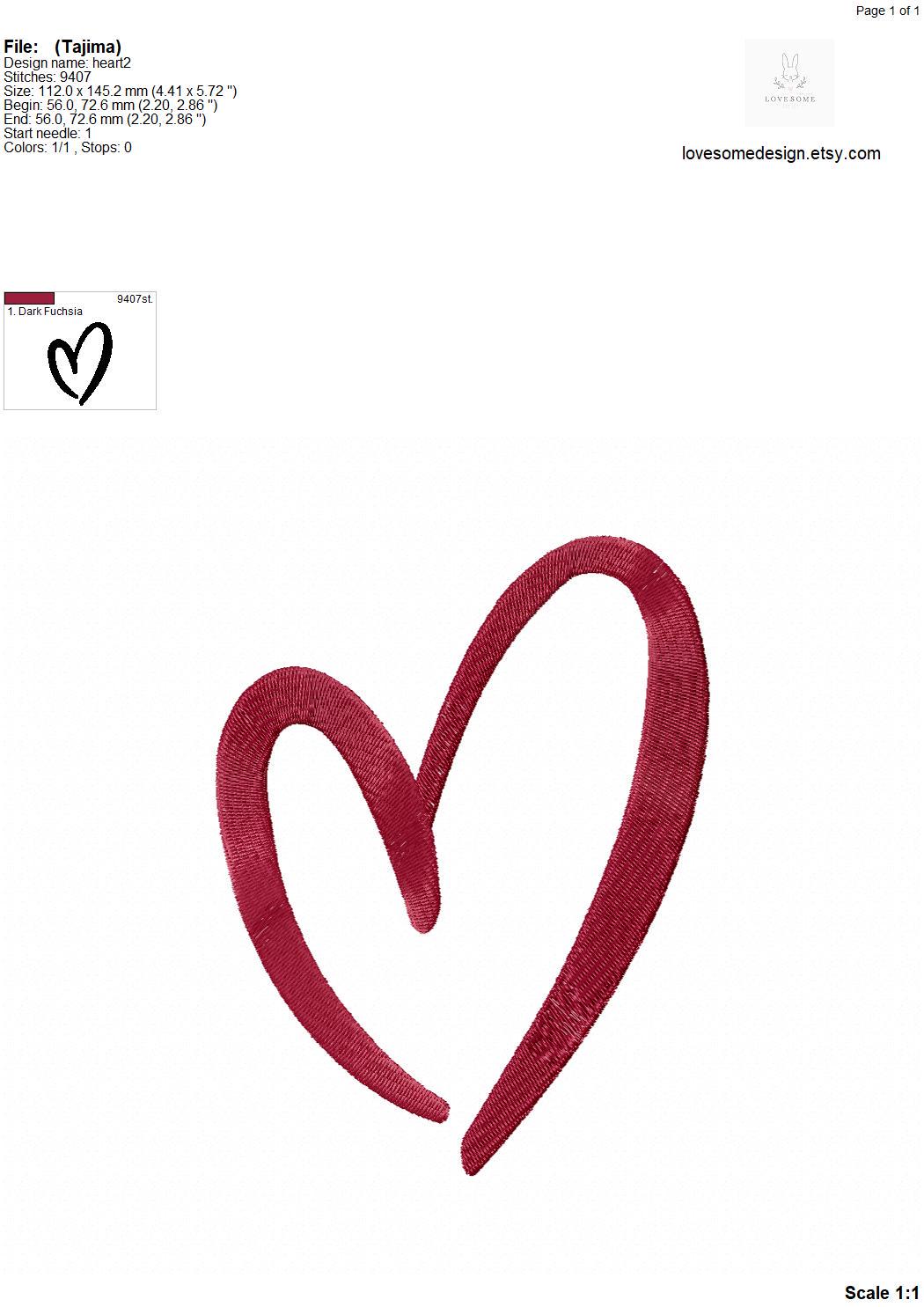 This listing includes one trendy stylish heart design for machine embroidery in three big sizes, 6inch, 5inch and 4inch, each in fill stitch for embroidery hoops 4x4 and bigger.