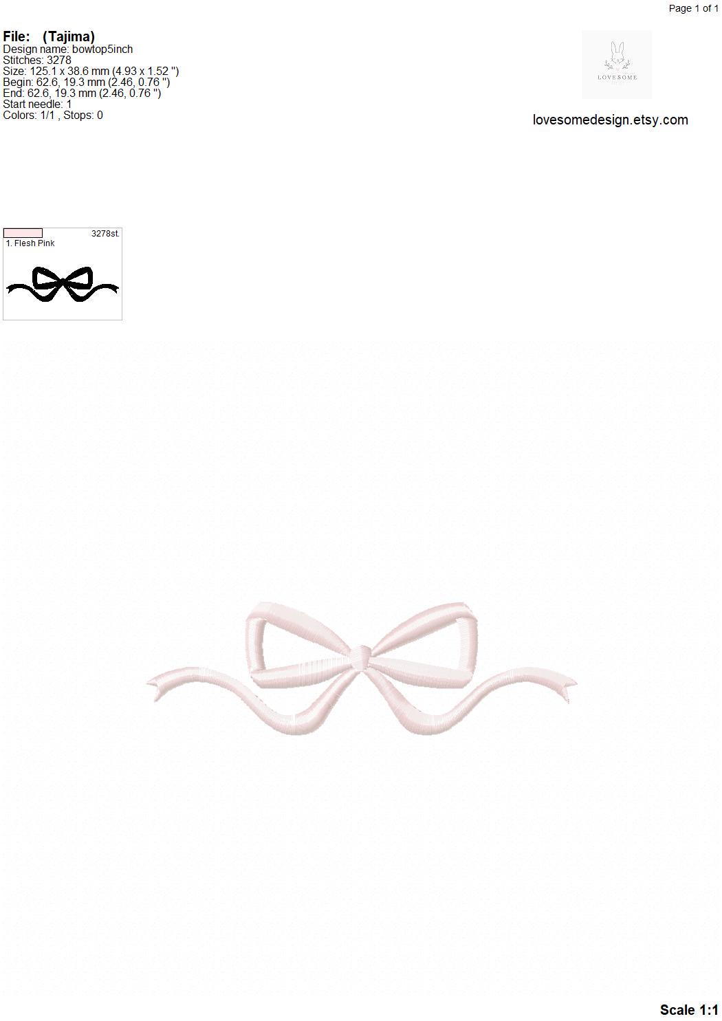 This listing includes one trendy stylish bow design for machine embroidery in three small sizes, 3inch, 4inch and 5inch, each in fill stitch for embroidery hoops in 4x4 and 5x7 inch sizes..