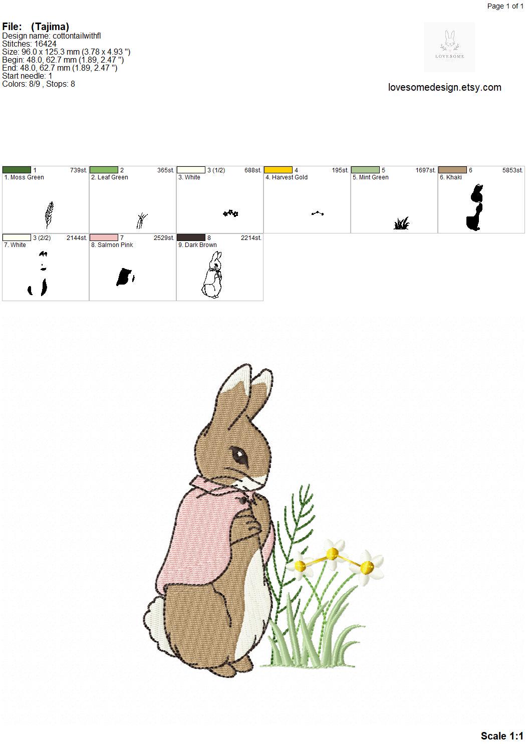 This listing features a machine embroidery file of Cottontail Rabbit with meadow florals design in 5 inch size.