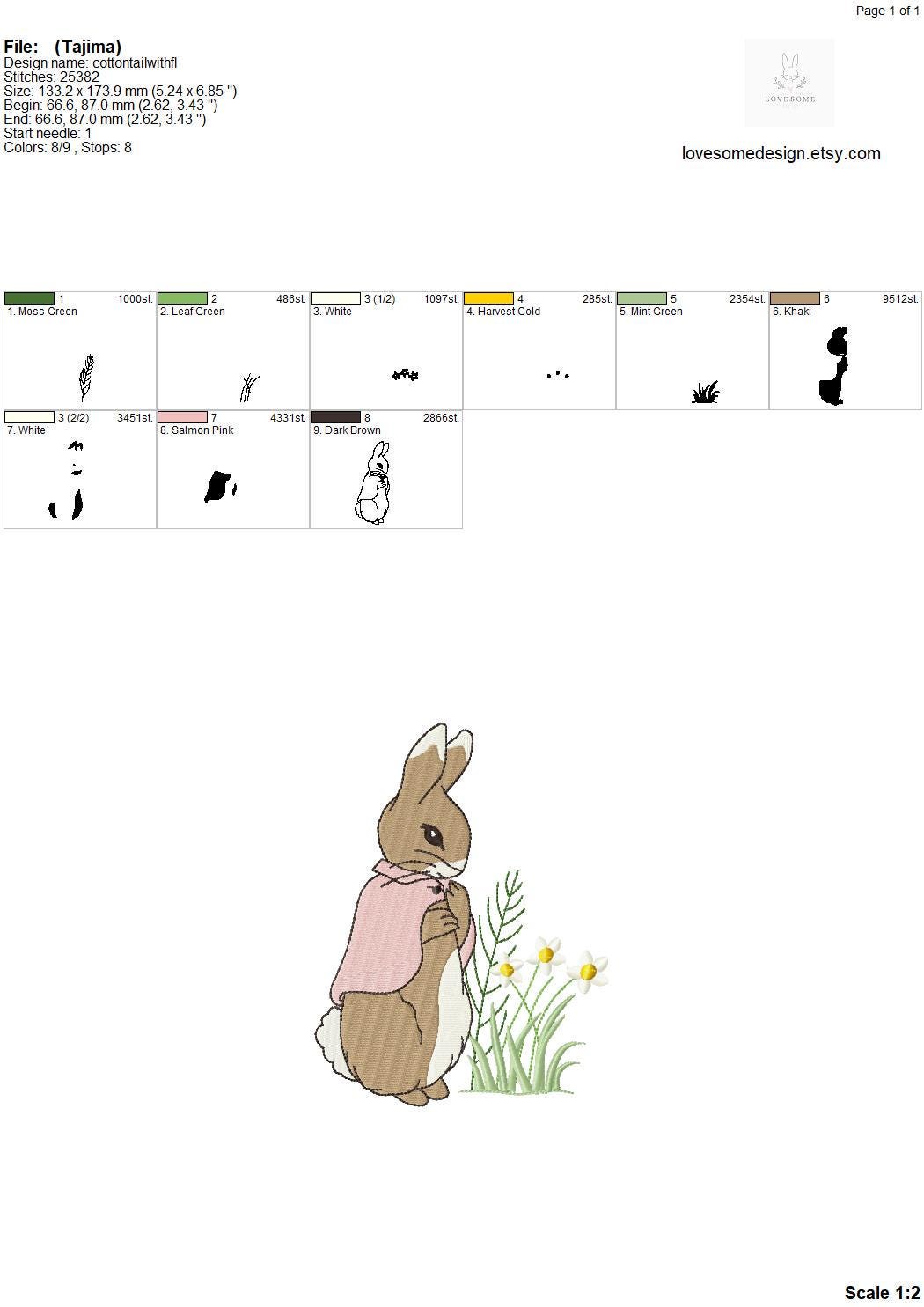 This listing features a machine embroidery file of Cottontail Rabbit with meadow florals design in 7 inch size.