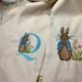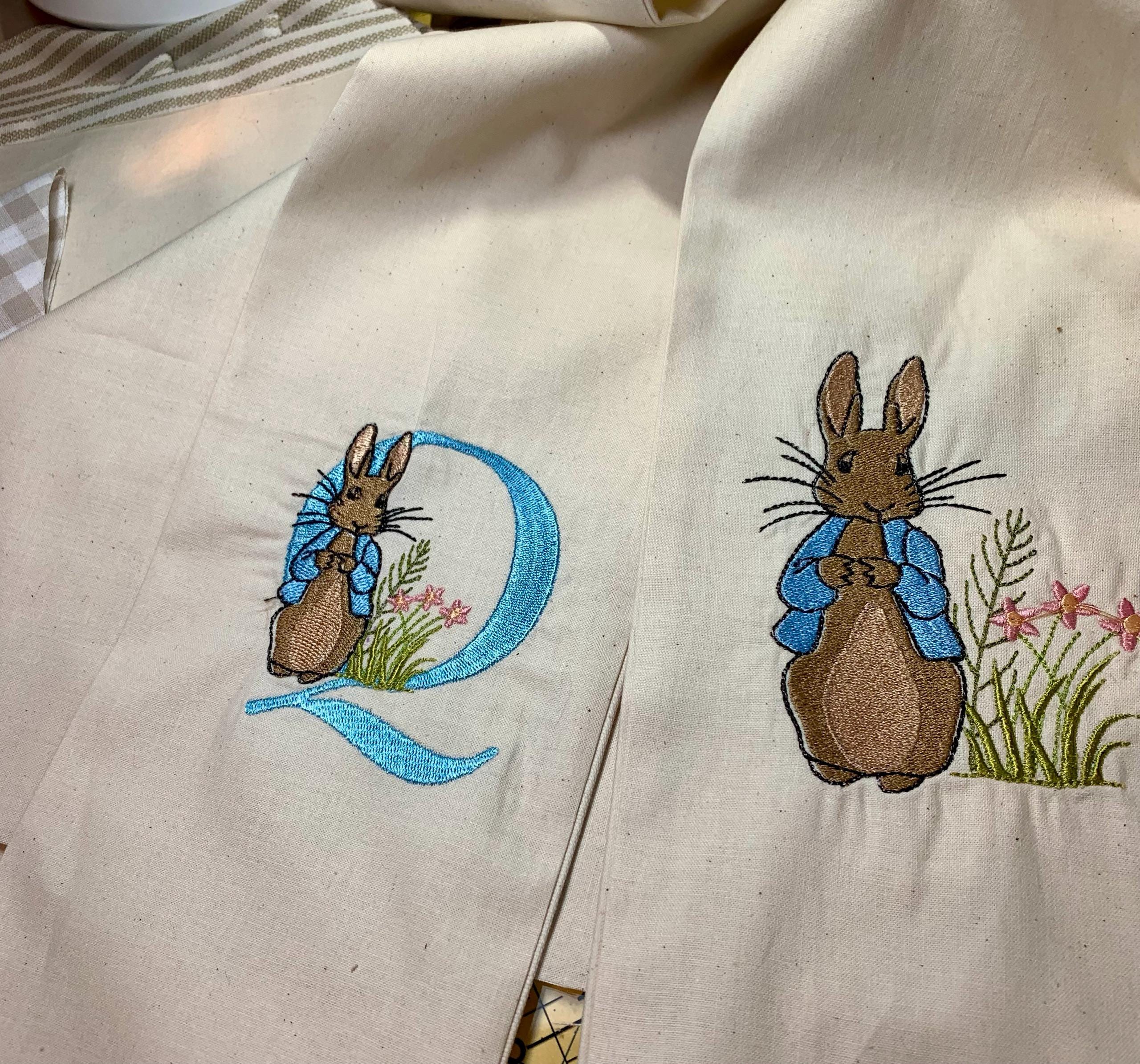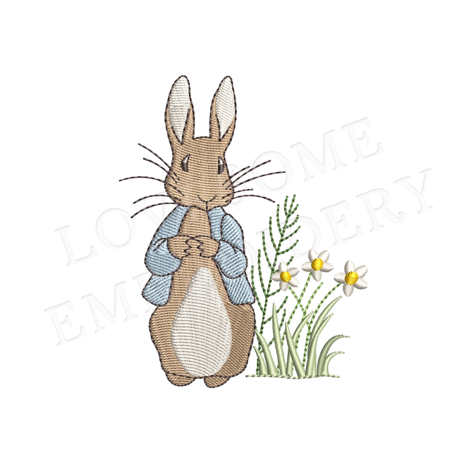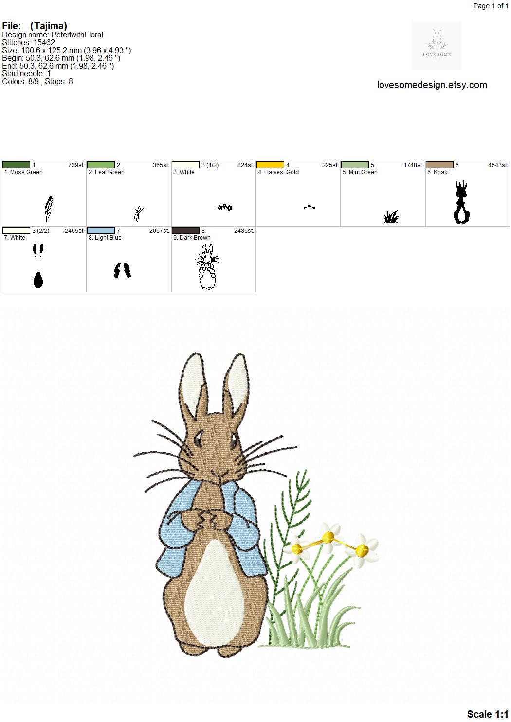 This listing features a machine embroidery file of Peter Rabbit with meadow florals design in 5 inch size.