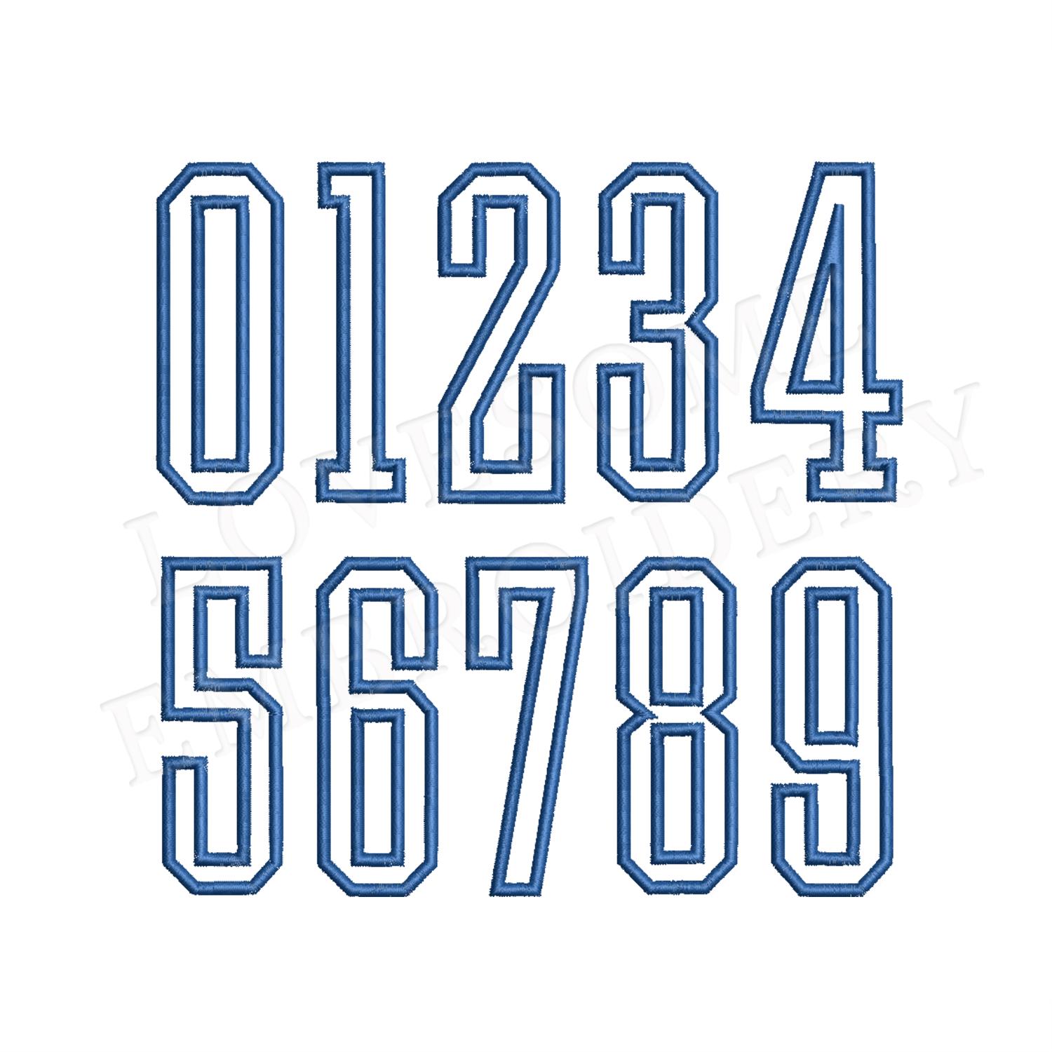 Tall College Satin Outline 5inch Numbers 0-9 Machine Embroidery Sports Numbers, Varsity Outline Embroidery Numbers | Lovesome Design