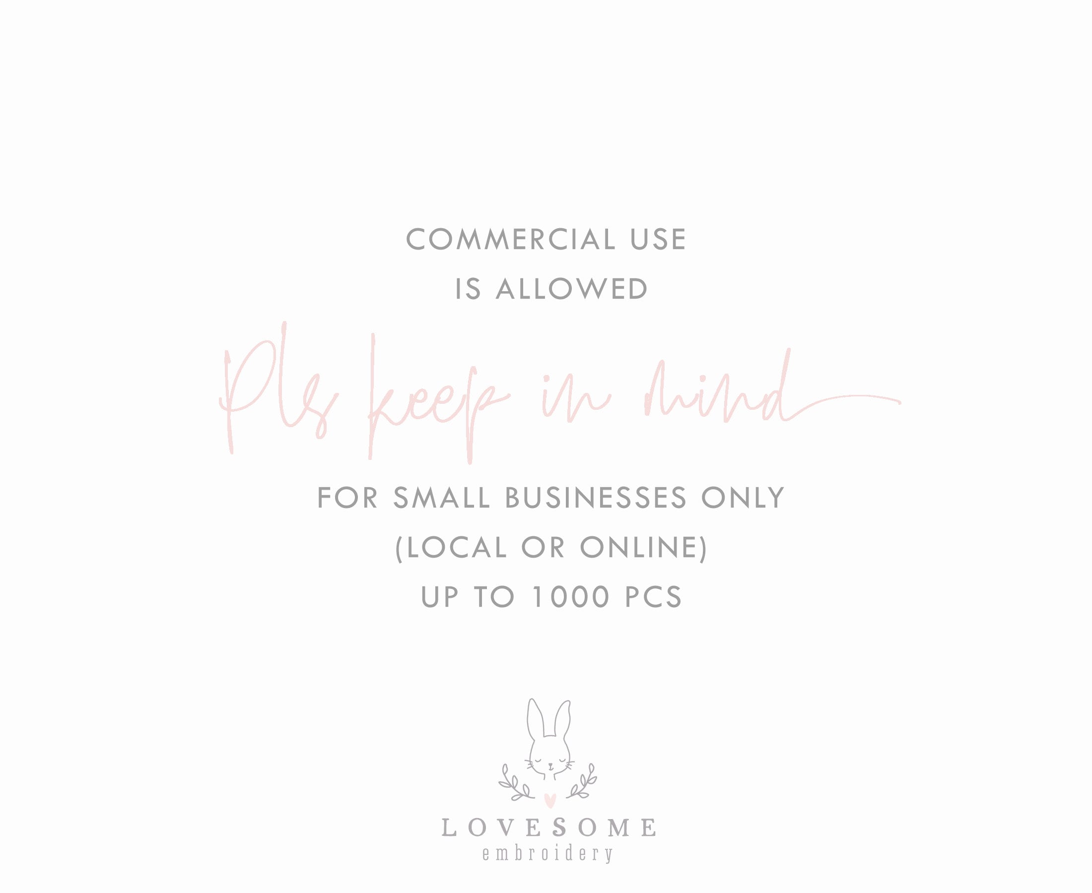 - Commercial use is allowed to stitch on and sell physical items for small business owners (local or online) up to 1000 pieces.
