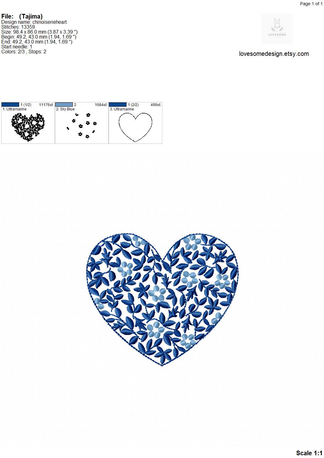 This listing features a machine embroidery file of Chinoiserie floral heart in 4 inches size.