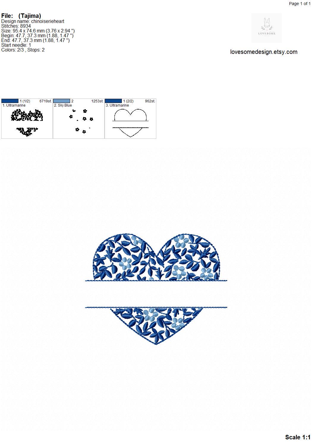 This listing features a machine embroidery file of Chinoiserie floral split heart in 4 inches size.