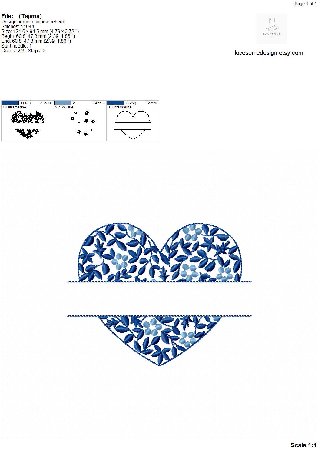 This listing features a machine embroidery file of Chinoiserie floral split heart in 5 inches size.