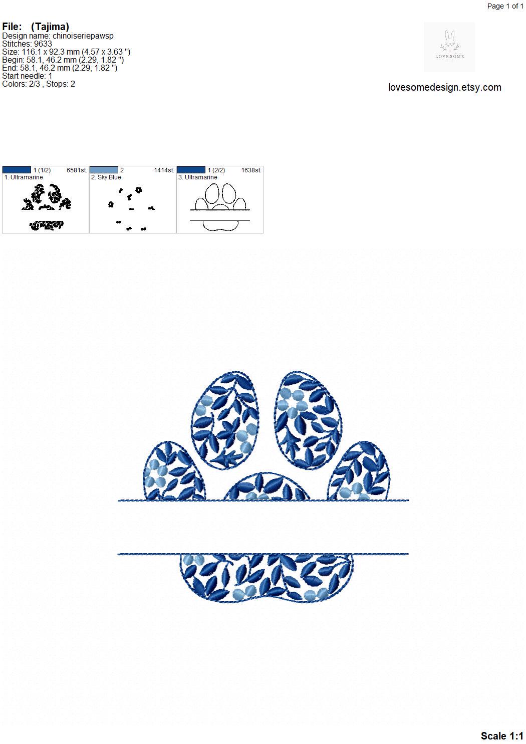 This listing features a machine embroidery file of Chinoiserie floral split paw print in 5 inches size.
