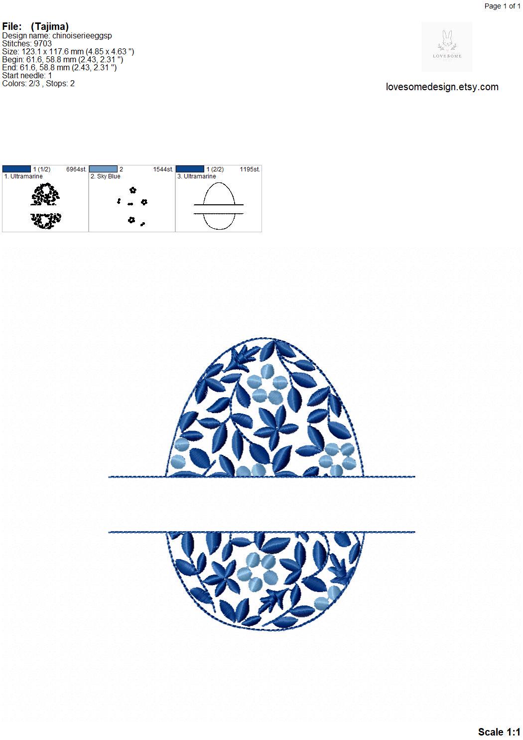 This listing features a machine embroidery file of Chinoiserie floral split egg in 5 inches size.
