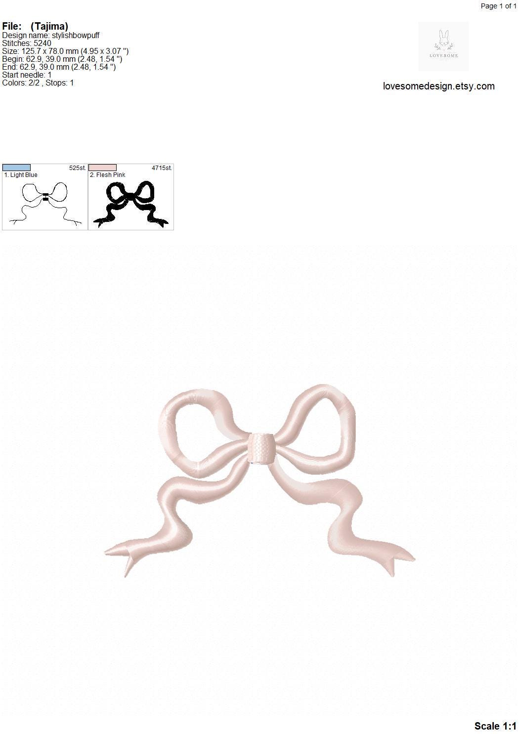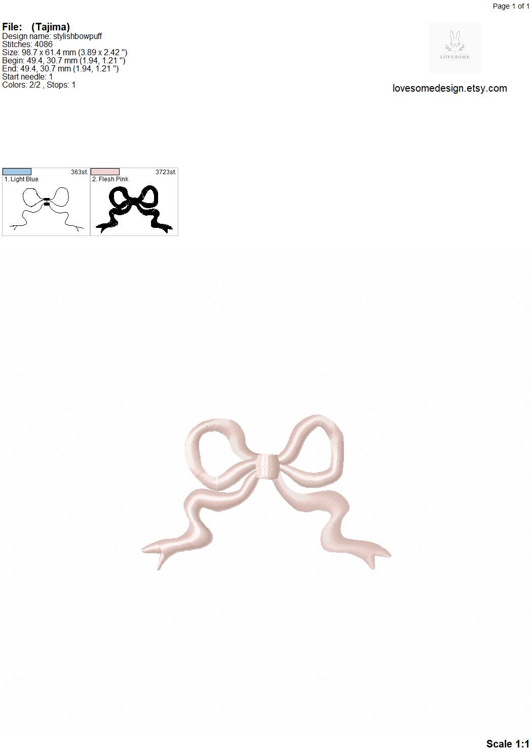 This listing includes one bow design for puff stitch machine embroidery in three sizes, each appr. 5inch, 4inch and 3.5inch size for embroidery hoops in different sizes.