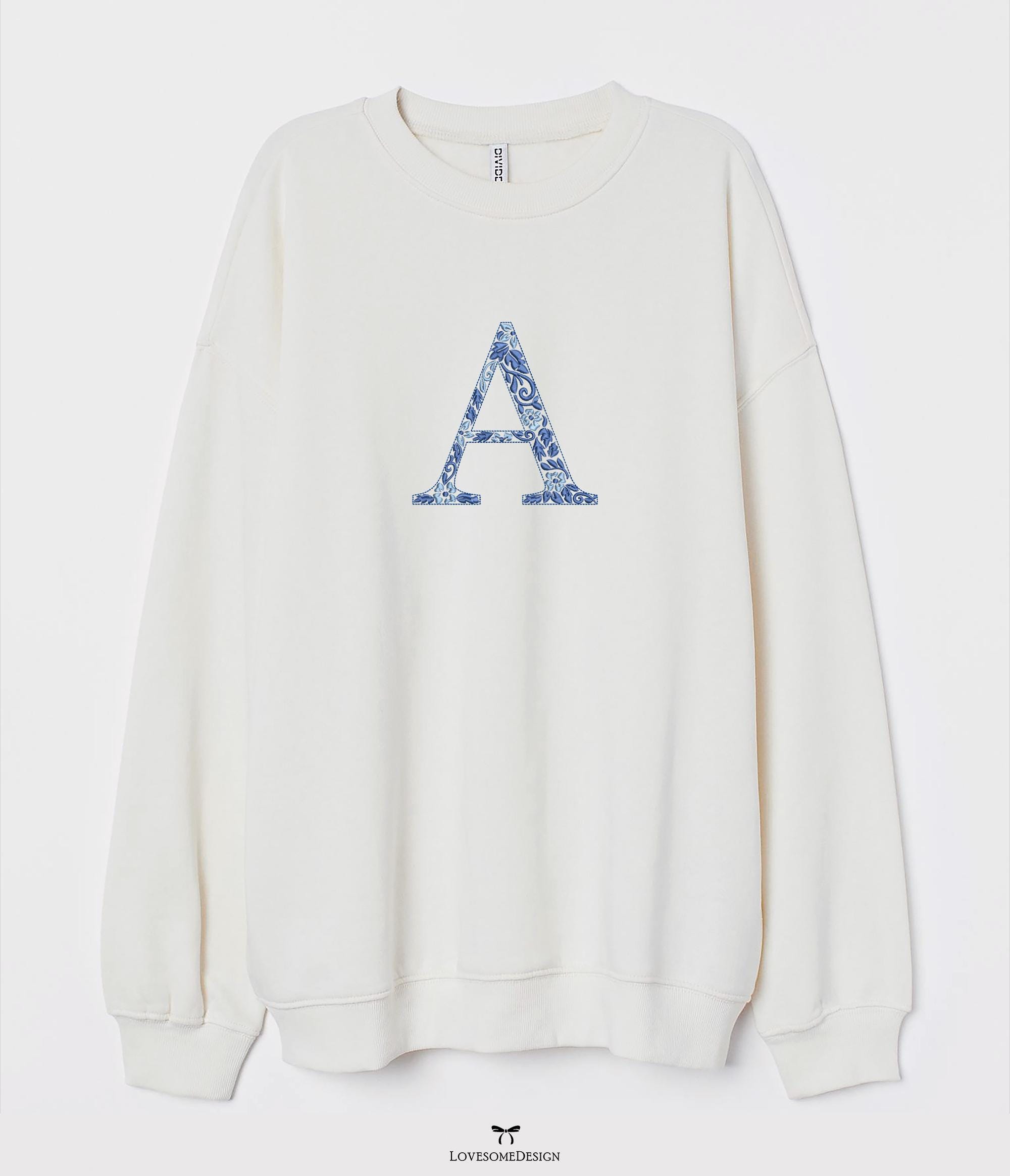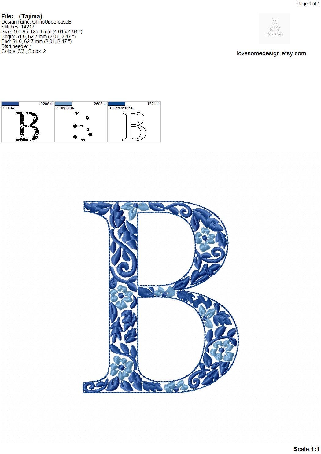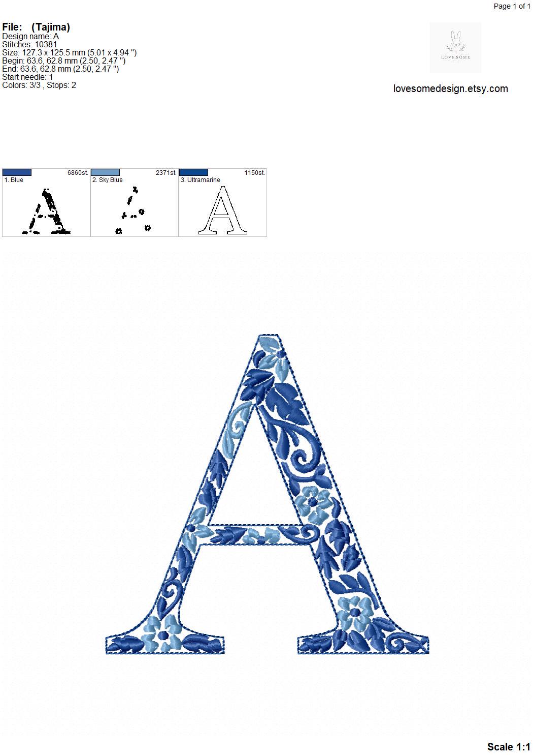 This listing features a machine embroidery font set which includes embroidery files of 26 uppercase chinoiserie floral fill letters with elegant blue colors in 5inch size. For the whole set, pls see the listing images.
