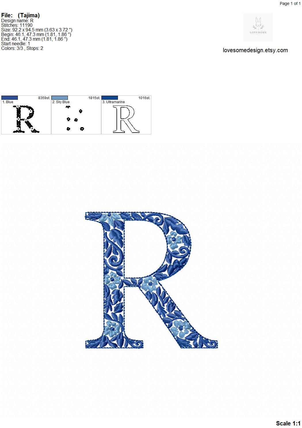 This listing features a machine embroidery file of one uppercase letter "R" which has a beautiful chinoiserie fill design with elegant blue colors in 4inch size.