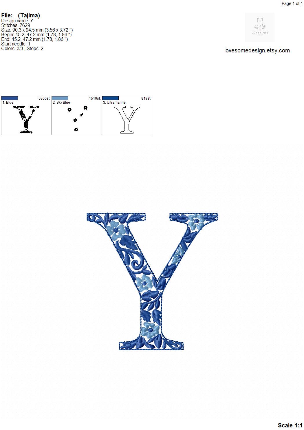 This listing features a machine embroidery file of one uppercase letter "Y" which has a beautiful chinoiserie fill design with elegant blue colors in 4inch size.