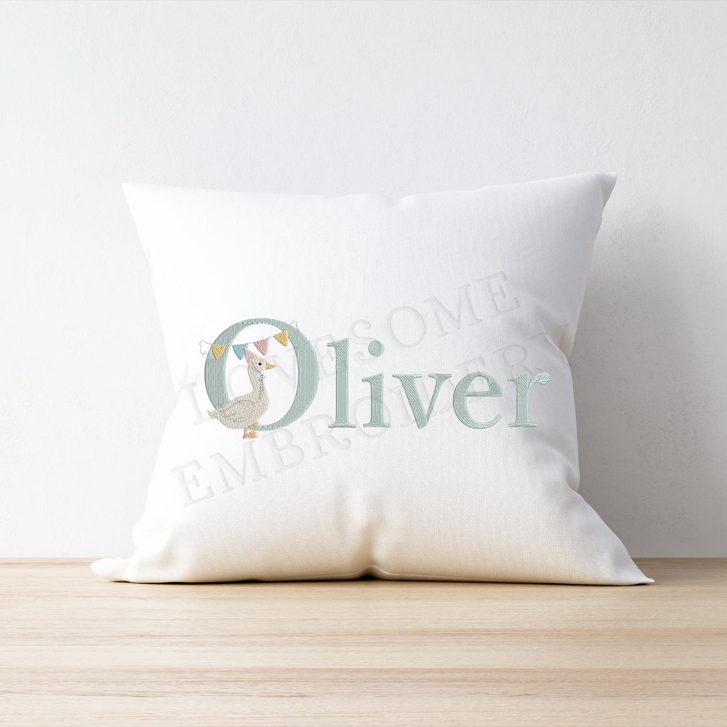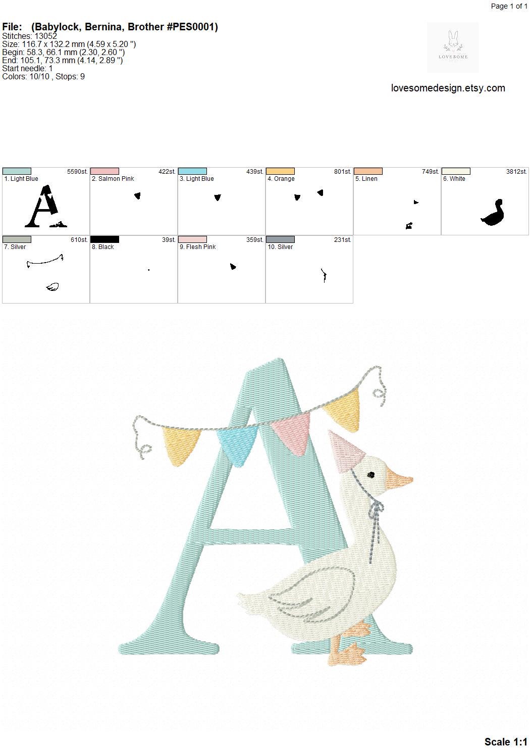This listing features a machine embroidery font set which includes embroidery files of 26 uppercase monogram letters with cute silly goose with a party hat and bunting design in 5inch size. (For the whole set, pls see the listing images.)