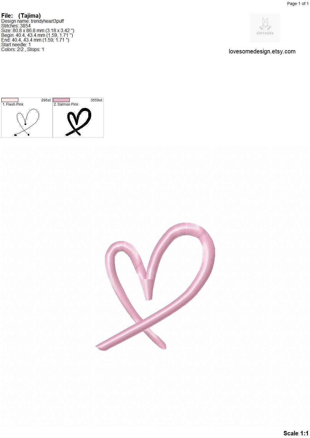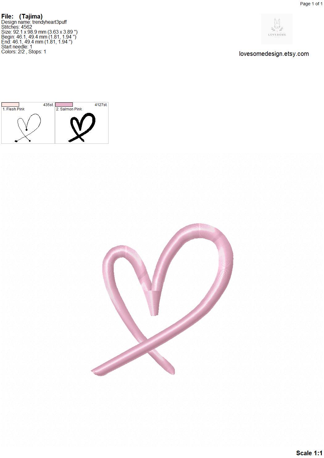 This listing includes one trendy stylish puff 3Dheart design for machine embroidery in three sizes, 4inch, 3.5inch and 3inch, each in puff stitch for embroidery hoops 4x4 and bigger.