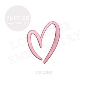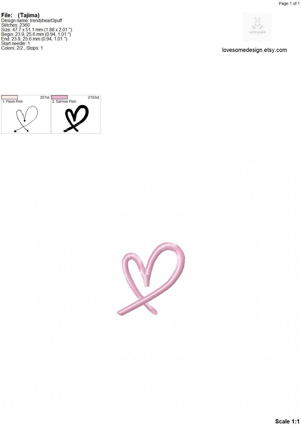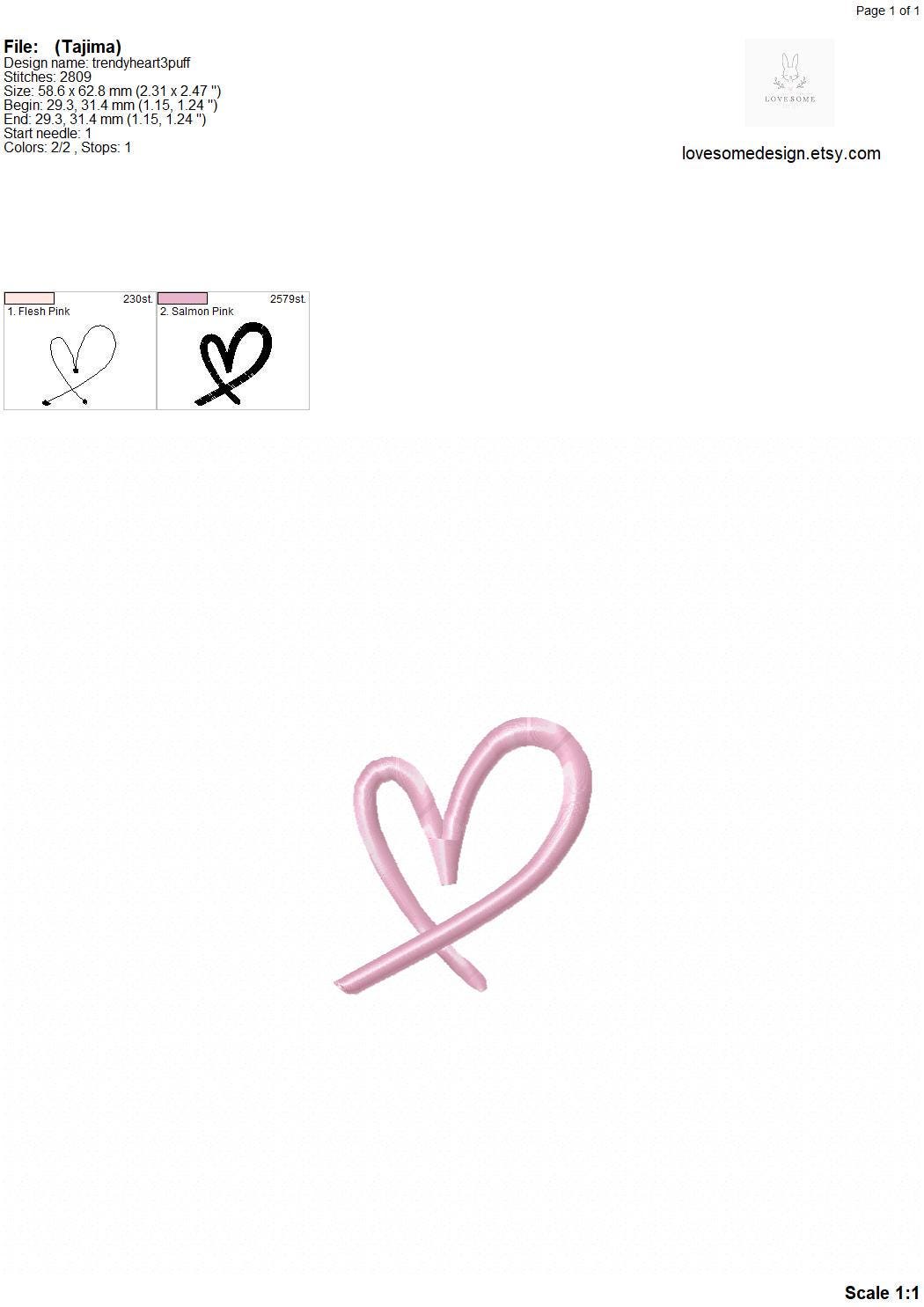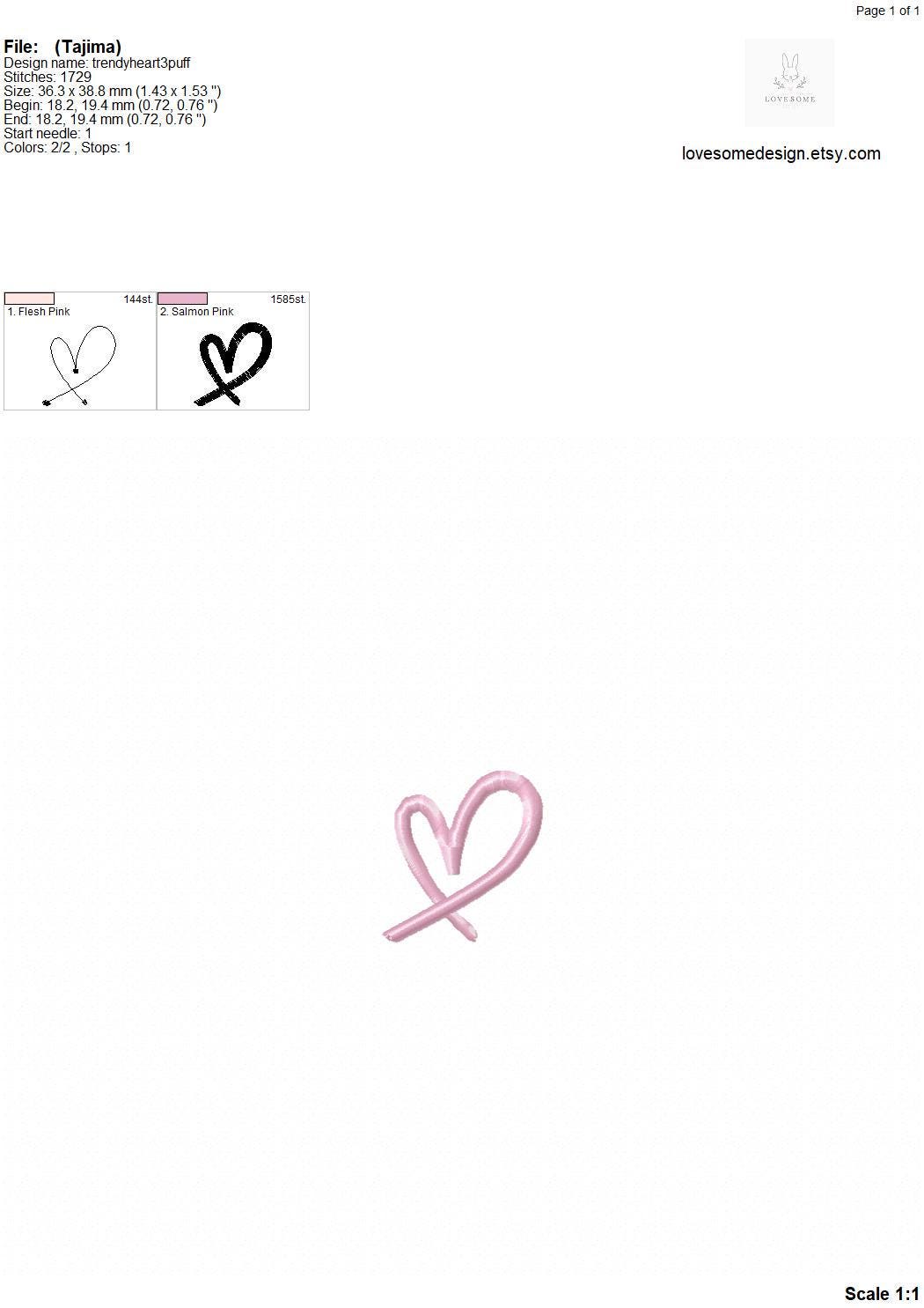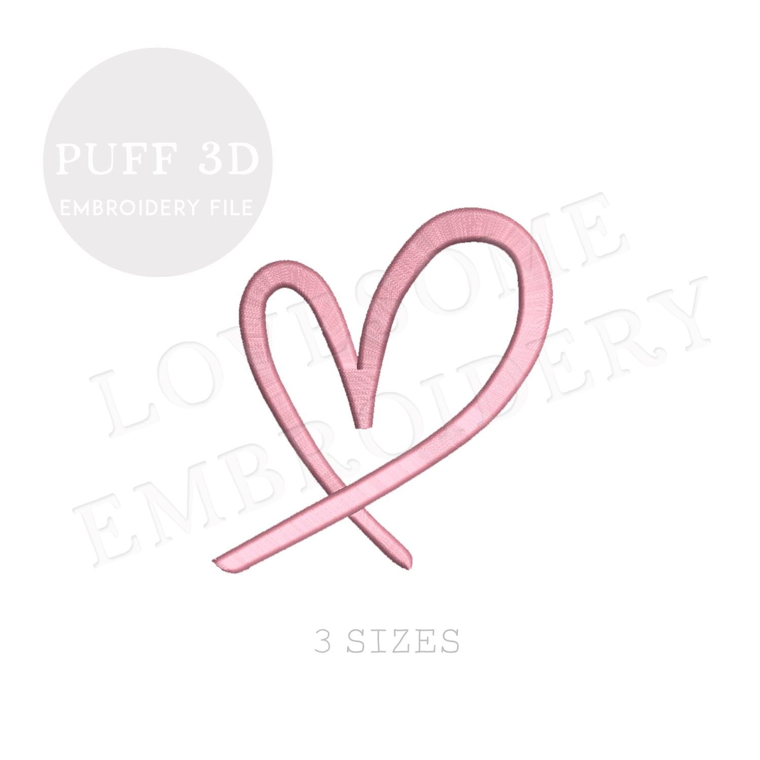 This listing includes one trendy stylish puff 3Dheart design for machine embroidery in three mini sizes, 2.5inch, 2inch and 1.5inch, each in puff stitch for embroidery hoops 4x4 and bigger.