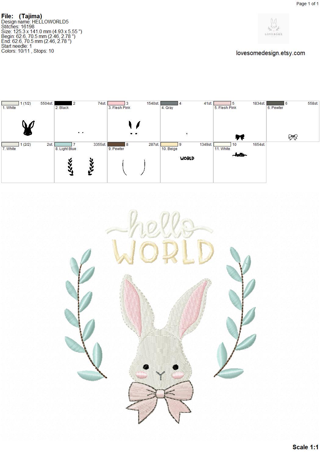 This listing features a machine embroidery file of Easter Rabbit with "Hello World" design in 5 inch size.