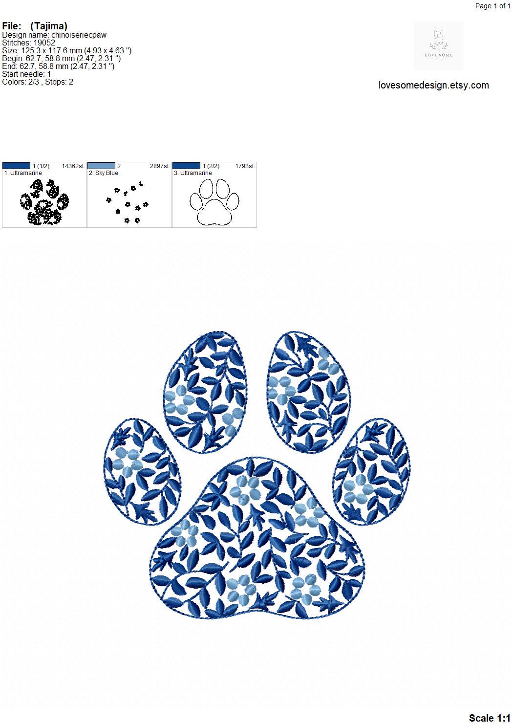 This listing features a machine embroidery file of Chinoiserie floral paw print in 5 inches size.
