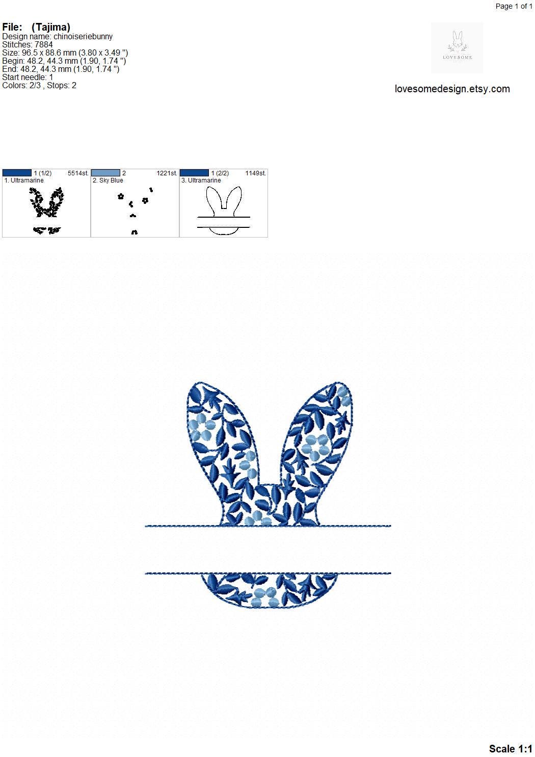This listing features a machine embroidery file of Chinoiserie floral split bunny in 4 inches size.