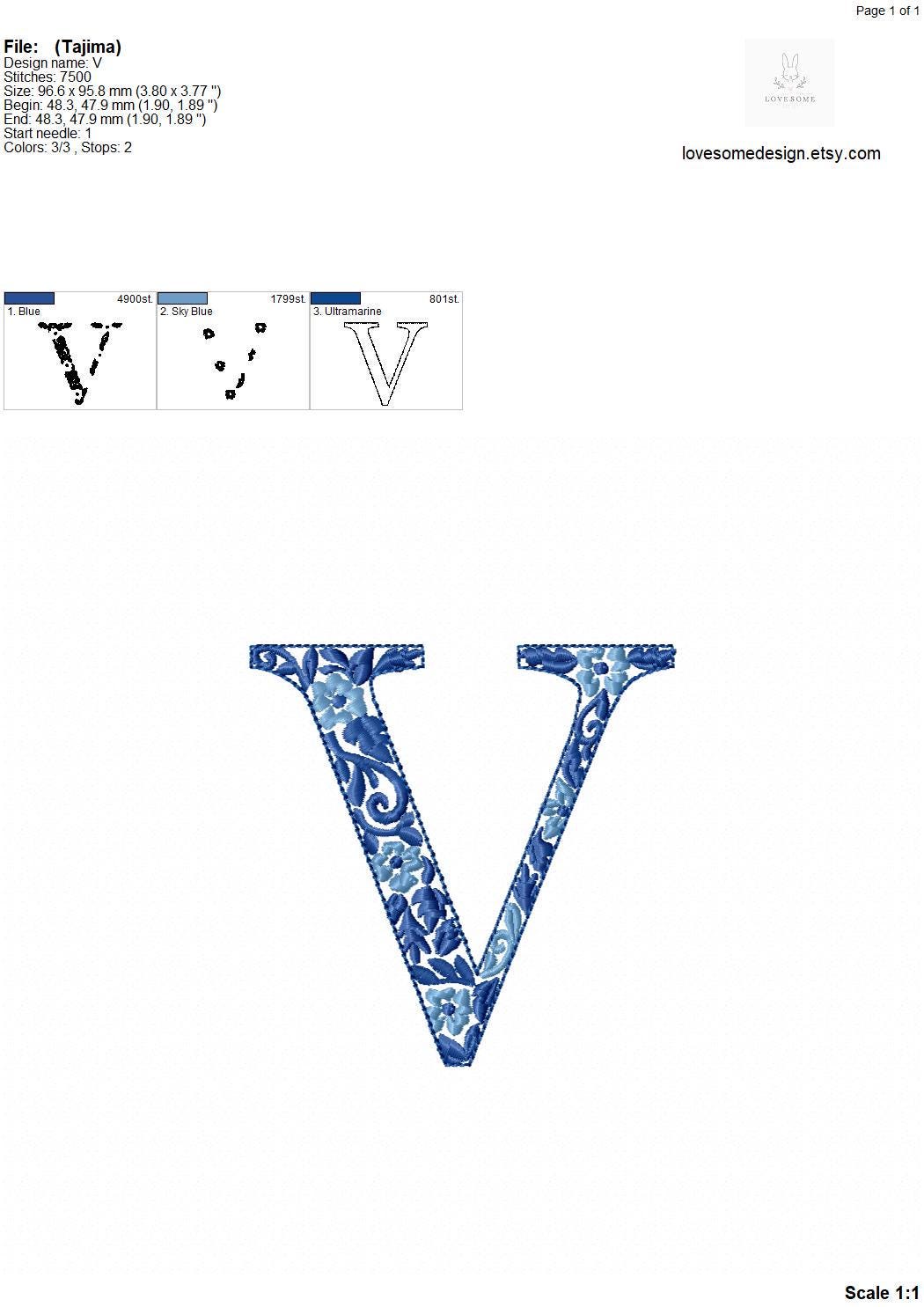This listing features a machine embroidery file of one uppercase letter "V" which has a beautiful chinoiserie fill design with elegant blue colors in 4inch size.