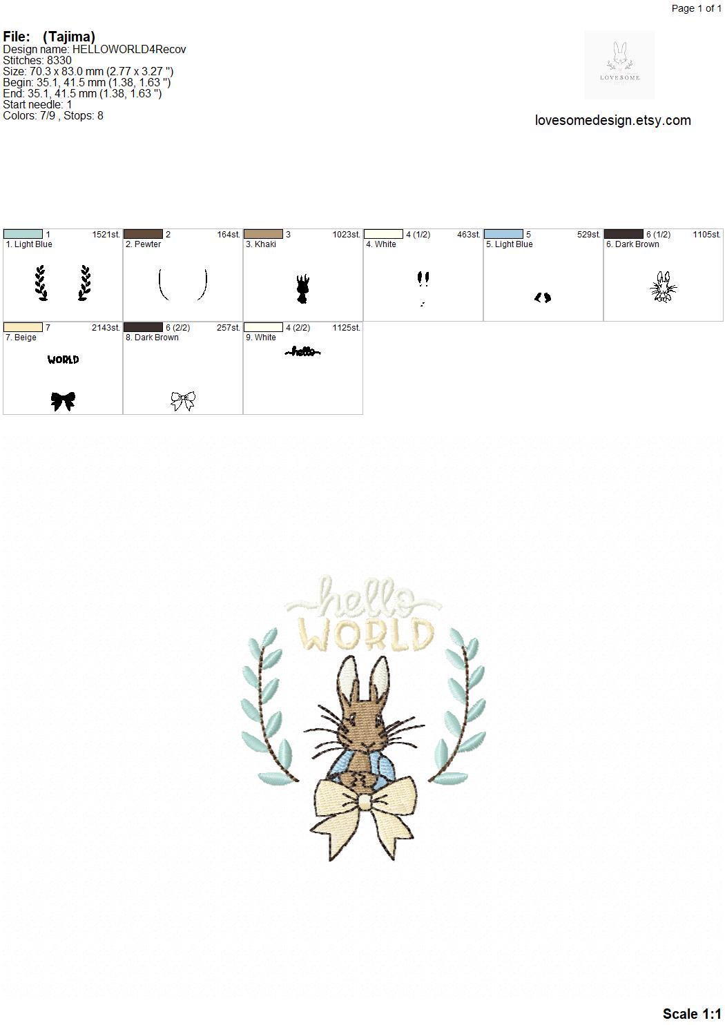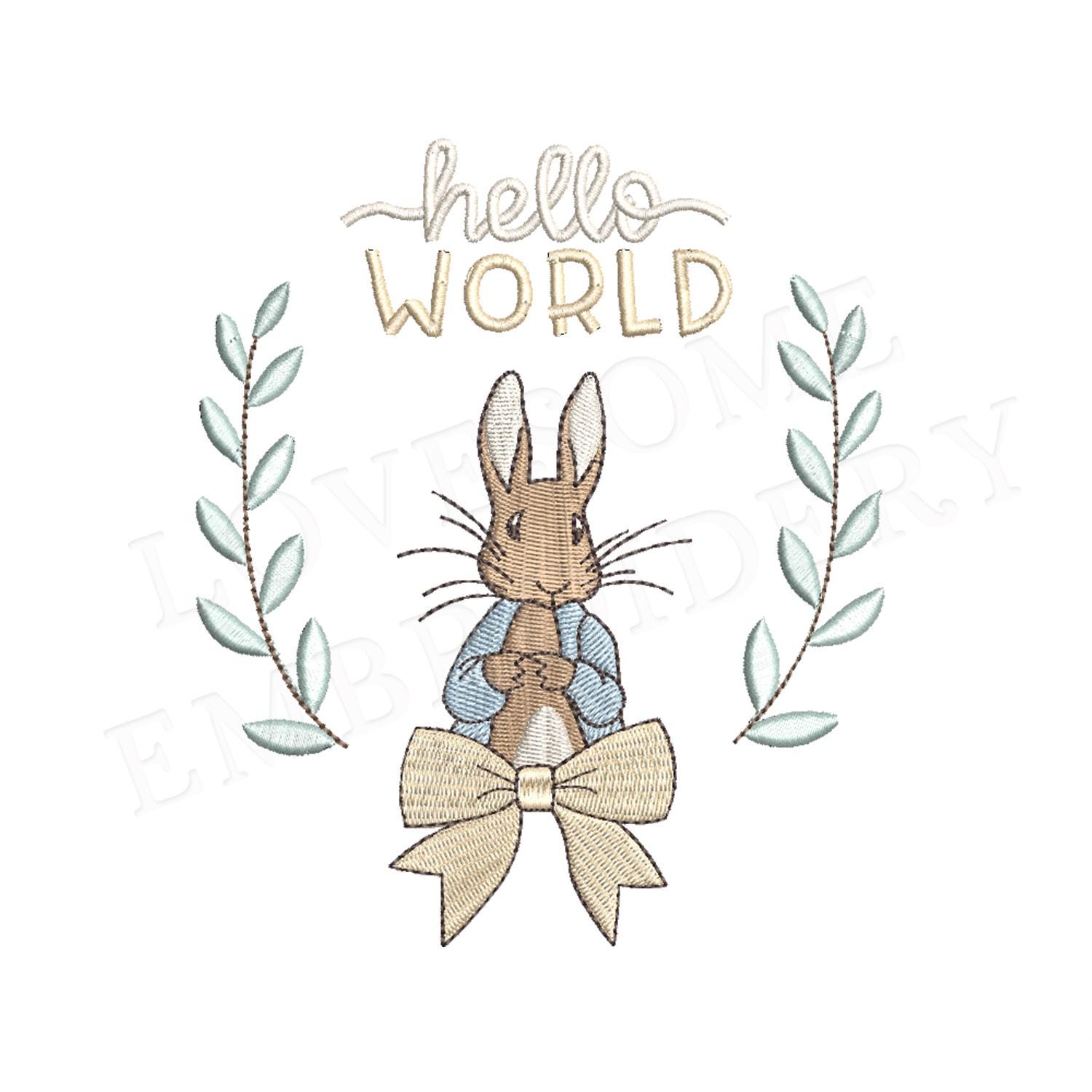 This listing features a machine embroidery file of Peter Rabbit with "Hello World" design appr. in 3 inch size.