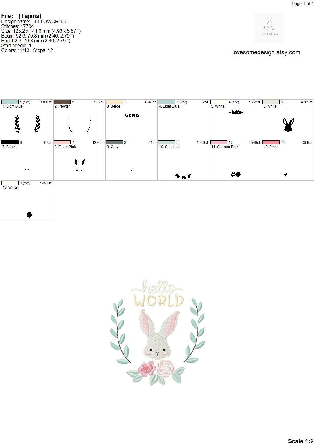 This listing features a machine embroidery file of floral Easter Rabbit with "Hello World" design in 5 inch size.